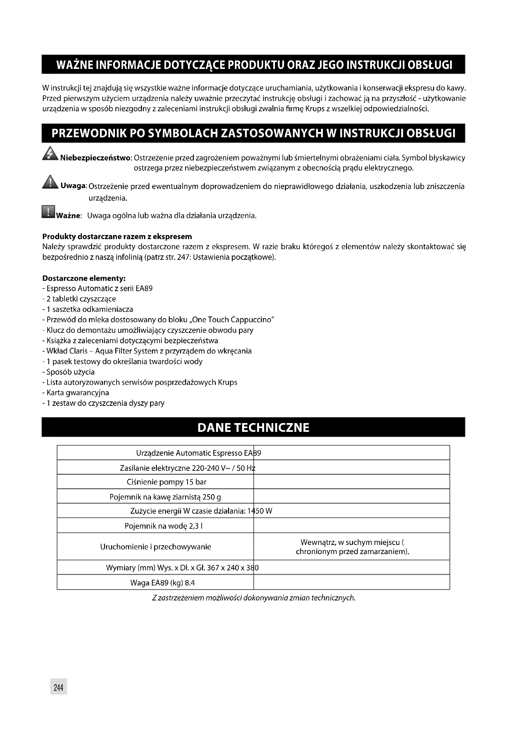 Ważne: Uwaga ogólna lub ważna dla działania urządzenia. Produkty dostarczane razem z ekspresem Należy sprawdzić produkty dostarczone razem z ekspresem. W razie braku któregoś z elementów należy skontaktować się bezpośrednio z naszą infolinią (patrz str. 247: Ustawienia początkowe). Dostarczone elementy: - Espresso Automatic z serii EA89 - 2 tabletki czyszczące - 1 saszetka odkamieniacza - Przewód do mleka dostosowany do bloku „One Touch Cappuccino” - Klucz do demontażu umożliwiający czyszczenie obwodu pary - Książka z zaleceniami dotyczącymi bezpieczeństwa - Wkład Claris – Aqua Filter System z przyrządem do wkręcania - 1 pasek testowy do określania twardości wody - Sposób użycia - Lista autoryzowanych serwisów posprzedażowych Krups - Karta gwarancyjna - 1 zestaw do czyszczenia dyszy pary DANE TECHNICZNE Urządzenie Automatic Espresso EA89 Zasilanie elektryczne 220-240 V~ / 50 Hz Ciśnienie pompy 15 bar Pojemnik na kawę ziarnistą 250 g Zużycie energii W czasie działania: 1450 W Pojemnik na wodę 2,3 l Uruchomienie i przechowywanie Wewnątrz, w suchym miejscu ( chronionym przed zamarzaniem). Wymiary (mm) Wys. x Dł. x Gł. 367 x 240 x 380 Waga EA89 (kg) 8.4 Z zastrzeżeniem możliwości dokonywania zmian technicznych.245