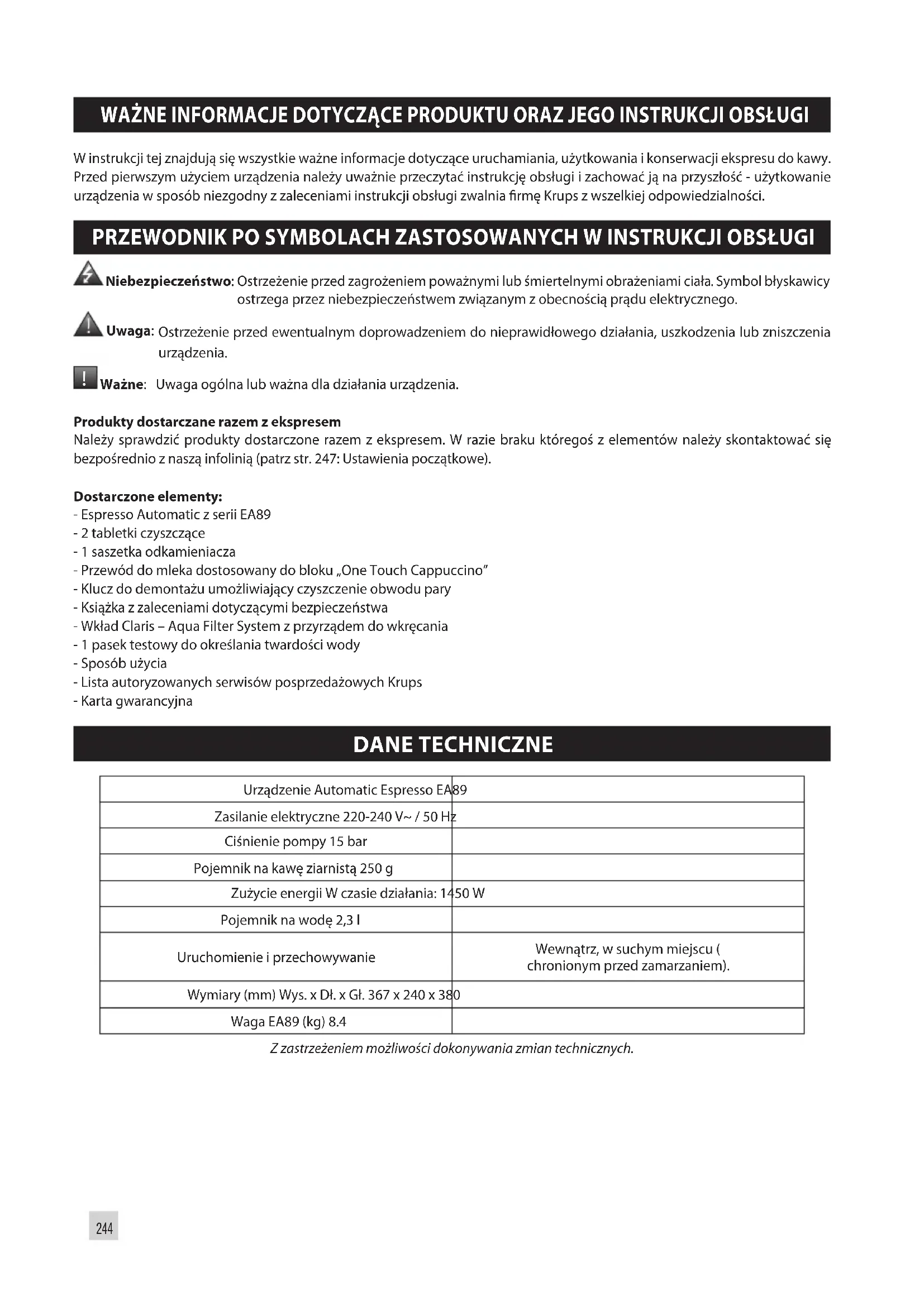 Ważne: Uwaga ogólna lub ważna dla działania urządzenia. Produkty dostarczane razem z ekspresem Należy sprawdzić produkty dostarczone razem z ekspresem. W razie braku któregoś z elementów należy skontaktować się bezpośrednio z naszą infolinią (patrz str. 247: Ustawienia początkowe). Dostarczone elementy: - Espresso Automatic z serii EA89 - 2 tabletki czyszczące - 1 saszetka odkamieniacza - Przewód do mleka dostosowany do bloku „One Touch Cappuccino” - Klucz do demontażu umożliwiający czyszczenie obwodu pary - Książka z zaleceniami dotyczącymi bezpieczeństwa - Wkład Claris – Aqua Filter System z przyrządem do wkręcania - 1 pasek testowy do określania twardości wody - Sposób użycia - Lista autoryzowanych serwisów posprzedażowych Krups - Karta gwarancyjna DANE TECHNICZNE Urządzenie Automatic Espresso EA89 Zasilanie elektryczne 220-240 V~ / 50 Hz Ciśnienie pompy 15 bar Pojemnik na kawę ziarnistą 250 g Zużycie energii W czasie działania: 1450 W Pojemnik na wodę 2,3 l Uruchomienie i przechowywanie Wewnątrz, w suchym miejscu ( chronionym przed zamarzaniem). Wymiary (mm) Wys. x Dł. x Gł. 367 x 240 x 380 Waga EA89 (kg) 8.4 Z zastrzeżeniem możliwości dokonywania zmian technicznych.245
