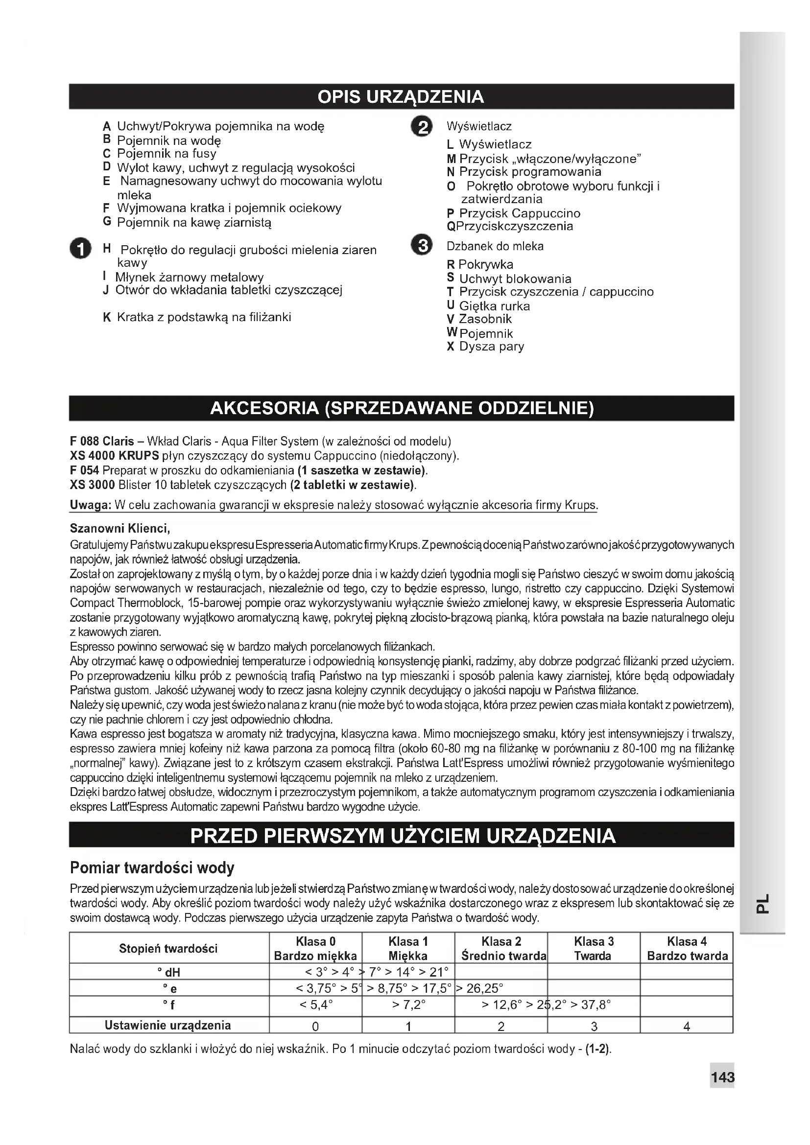 Dysza pary AKCESORIA (SPRZEDAWANE ODDZIELNIE) F 088 Claris – Wkład Claris - Aqua Filter System (w zależności od modelu) XS 4000 KRUPS płyn czyszczący do systemu Cappuccino (niedołączony). F 054 Preparat w proszku do odkamieniania (1 saszetka w zestawie). XS 3000 Blister 10 tabletek czyszczących (2 tabletki w zestawie). Uwaga: W celu zachowania gwarancji w ekspresie należy stosować wyłącznie akcesoria firmy Krups. Szanowni Klienci, Gratulujemy Państwu zakupu ekspresu Espresseria Automatic firmy Krups. Z pewnością docenią Państwo zarówno jakość przygotowywanych napojów, jak również łatwość obsługi urządzenia. Został on zaprojektowany z myślą o tym, by o każdej porze dnia i w każdy dzień tygodnia mogli się Państwo cieszyć w swoim domu jakością napojów serwowanych w restauracjach, niezależnie od tego, czy to będzie espresso, lungo, ristretto czy cappuccino. Dzięki Systemowi Compact Thermoblock, 15-barowej pompie oraz wykorzystywaniu wyłącznie świeżo zmielonej kawy, w ekspresie Espresseria Automatic zostanie przygotowany wyjątkowo aromatyczną kawę, pokrytej piękną złocisto-brązową pianką, która powstała na bazie naturalnego oleju z kawowych ziaren. Espresso powinno serwować się w bardzo małych porcelanowych filiżankach. Aby otrzymać kawę o odpowiedniej temperaturze i odpowiednią konsystencję pianki, radzimy, aby dobrze podgrzać filiżanki przed użyciem. Po przeprowadzeniu kilku prób z pewnością trafią Państwo na typ mieszanki i sposób palenia kawy ziarnistej, które będą odpowiadały Państwa gustom. Jakość używanej wody to rzecz jasna kolejny czynnik decydujący o jakości napoju w Państwa filiżance. Należy się upewnić, czy woda jest świeżo nalana z kranu (nie może być to woda stojąca, która przez pewien czas miała kontakt z powietrzem), czy nie pachnie chlorem i czy jest odpowiednio chłodna. Kawa espresso jest bogatsza w aromaty niż tradycyjna, klasyczna kawa. Mimo mocniejszego smaku, który jest intensywniejszy i trwalszy, espresso zawiera mniej kofeiny niż kawa parzona za pomocą filtra (około 60-80 mg na filiżankę w porównaniu z 80-100 mg na filiżankę „normalnej” kawy). Związane jest to z krótszym czasem ekstrakcji. Państwa Latt'Espress umożliwi również przygotowanie wyśmienitego cappuccino dzięki inteligentnemu systemowi łączącemu pojemnik na mleko z urządzeniem. Dzięki bardzo łatwej obsłudze, widocznym i przezroczystym pojemnikom, a także automatycznym programom czyszczenia i odkamieniania ekspres Latt'Espress Automatic zapewni Państwu bardzo wygodne użycie.