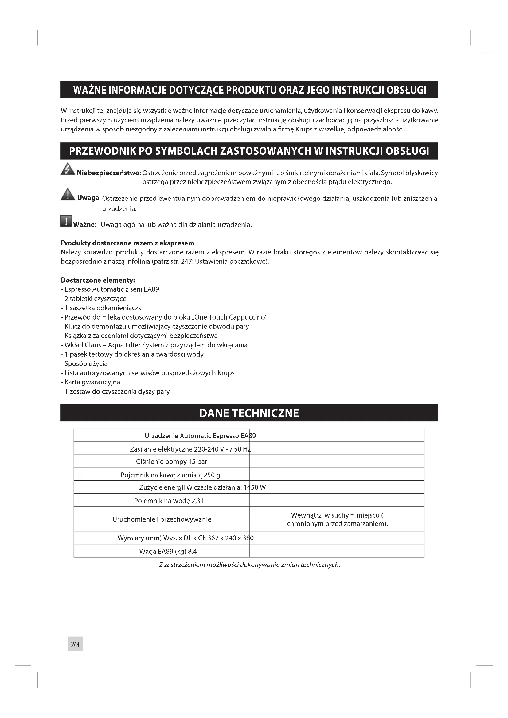Ważne: Uwaga ogólna lub ważna dla działania urządzenia. Produkty dostarczane razem z ekspresem Należy sprawdzić produkty dostarczone razem z ekspresem. W razie braku któregoś z elementów należy skontaktować się bezpośrednio z naszą infolinią (patrz str. 247: Ustawienia początkowe). Dostarczone elementy: - Espresso Automatic z serii EA89 - 2 tabletki czyszczące - 1 saszetka odkamieniacza - Przewód do mleka dostosowany do bloku „One Touch Cappuccino” - Klucz do demontażu umożliwiający czyszczenie obwodu pary - Książka z zaleceniami dotyczącymi bezpieczeństwa - Wkład Claris – Aqua Filter System z przyrządem do wkręcania - 1 pasek testowy do określania twardości wody - Sposób użycia - Lista autoryzowanych serwisów posprzedażowych Krups - Karta gwarancyjna - 1 zestaw do czyszczenia dyszy pary DANE TECHNICZNE Urządzenie Automatic Espresso EA89 Zasilanie elektryczne 220-240 V~ / 50 Hz Ciśnienie pompy 15 bar Pojemnik na kawę ziarnistą 250 g Zużycie energii W czasie działania: 1450 W Pojemnik na wodę 2,3 l Uruchomienie i przechowywanie Wewnątrz, w suchym miejscu ( chronionym przed zamarzaniem). Wymiary (mm) Wys. x Dł. x Gł. 367 x 240 x 380 Waga EA89 (kg) 8.4 Z zastrzeżeniem możliwości dokonywania zmian technicznych.245