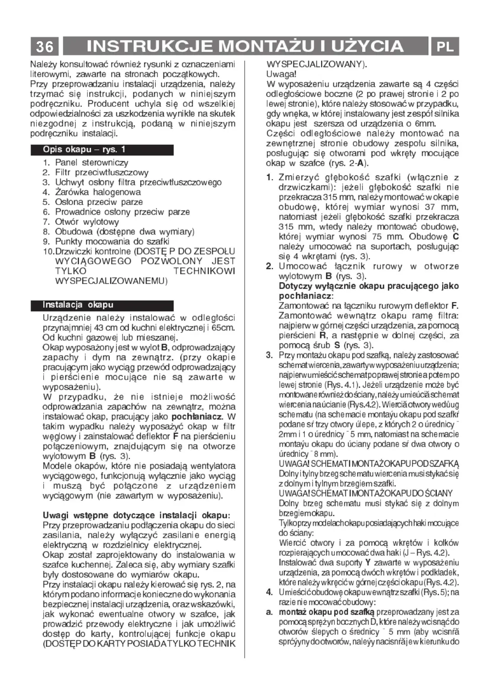 (rys. 3). Modeleokapów,którenieposiadaj¹wentylatora wyci¹gowego,funkcjonuj¹wy³¹czniejakowyci¹g i musz¹ byæ po³¹czone z urz¹dzeniem wyci¹gowym (nie zawartym w wyposa¿eniu). Uwagi wstêpne dotycz¹ce instalacji okapu: Przyprzeprowadzaniupod³¹czeniaokapudo sieci zasilania, nale¿y wy³¹czyæ zasilanie energi¹ elektryczn¹ w rozdzielnicy elektrycznej. Okap zosta³ zaprojektowany do instalowania w szafcekuchennej.Zalecasiê,abywymiaryszafki by³ydostosowanedowymiarówokapu. Przyinstalacjiokapunale¿ykierowaæsiê rys.2,na którympodanoinformacjekoniecznedowykonania bezpiecznejinstalacjiurz¹dzenia,orazwskazówki, jak wykonaæ ewentualne otwory w szafce, jak prowadziæ przewody elektryczne i jak umo¿liwiæ dostêp do karty, kontroluj¹cej funkcje okapu (DOSTÊPDOKARTYPOSIADATYLKOTECHNIK WYSPECJALIZOWANY). Uwaga! Wwyposa¿eniuurz¹dzeniazawartes¹4czêci odleg³ocioweboczne(2poprawejstroniei2po lewejstronie),którenale¿ystosowaæwprzypadku, gdywnêka,wktórejinstalowany jestzespó³silnika okapujestszerszaodurz¹dzeniao6mm. Czêci odleg³ociowe nale¿y montowaæ na zewnêtrznej stronie obudowy zespo³u silnika, pos³uguj¹c siê otworami pod wkrêty mocuj¹ce okap w szafce (rys. 2-