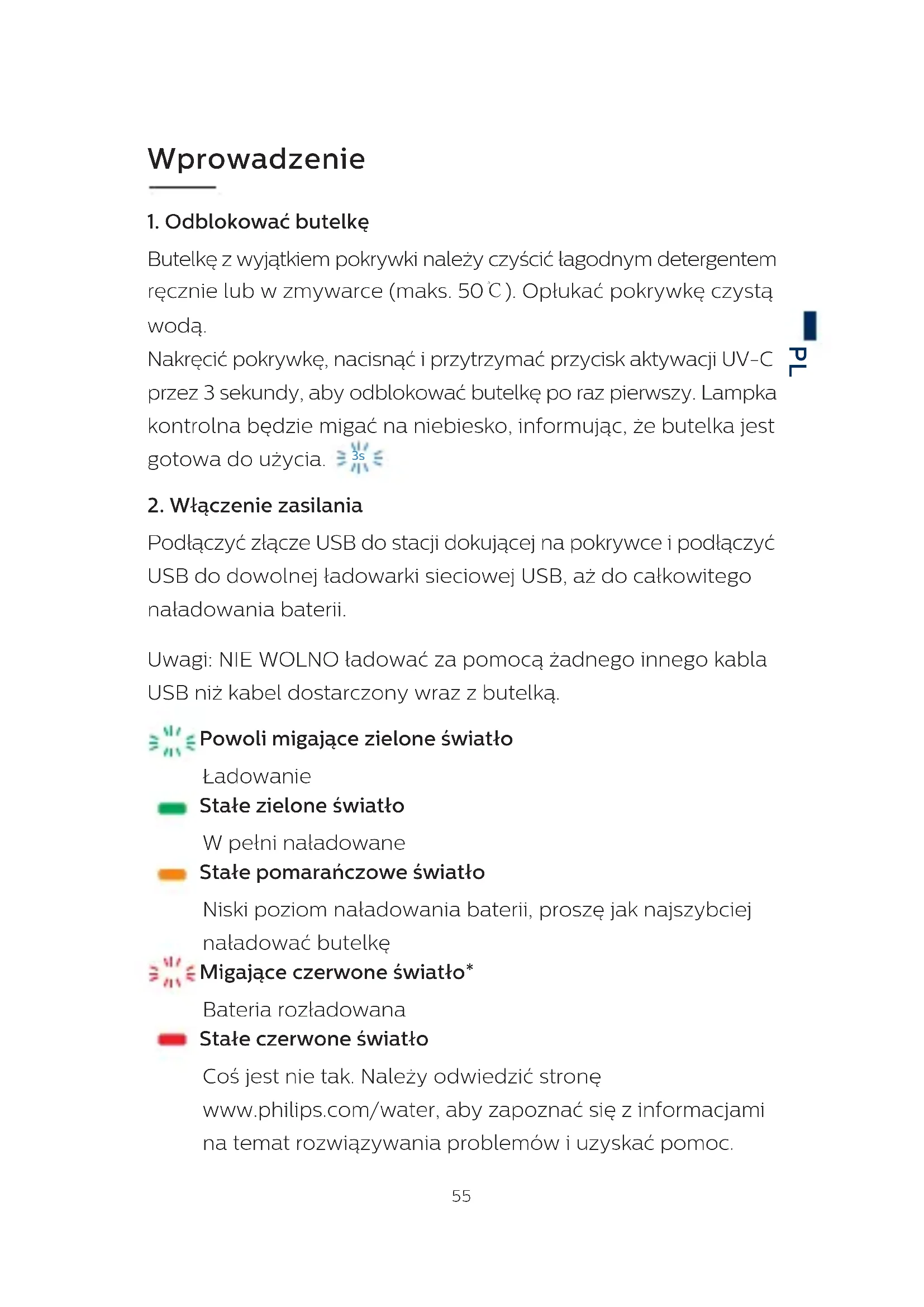 Podłączyć złącze USB do stacji dokującej na pokrywce i podłączyć USB do dowolnej ładowarki sieciowej USB, aż do całkowitego naładowania baterii. Uwagi: NIE WOLNO ładować za pomocą żadnego innego kabla USB niż kabel dostarczony wraz z butelką. Powoli migające zielone światło Ładowanie Stałe zielone światło W pełni naładowane Stałe pomarańczowe światło Niski poziom naładowania baterii, proszę jak najszybciej naładować butelkę Migające czerwone światło* Bateria rozładowana Stałe czerwone światło Coś jest nie tak. Należy odwiedzić stronę www.philips.com/water, aby zapoznać się z informacjami na temat rozwiązywania problemów i uzyskać pomoc.