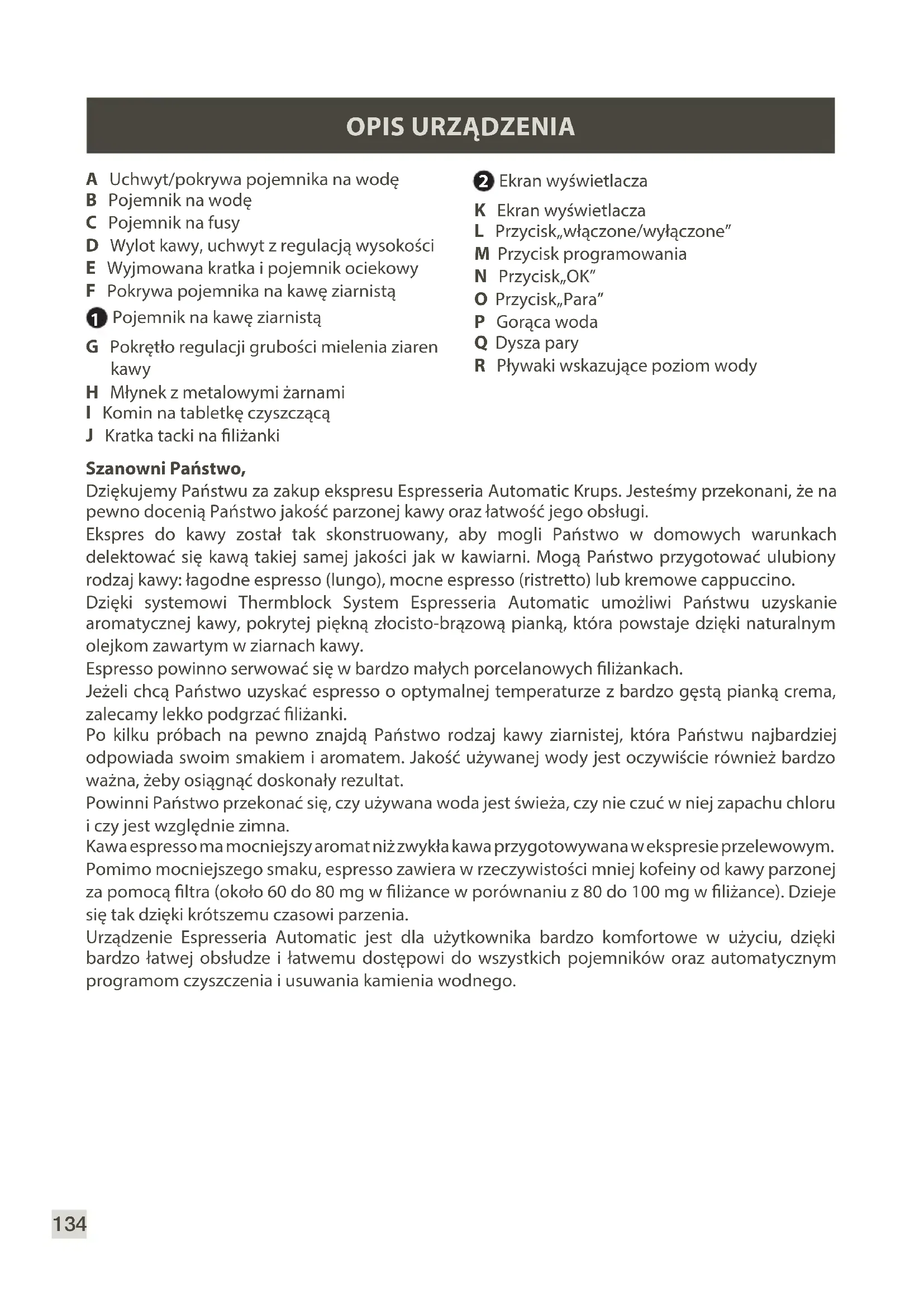 Ekran wyświetlacza K Ekran wyświetlacza L Przycisk„włączone/wyłączone” M Przycisk programowania N Przycisk„OK” O Przycisk„Para” P Gorąca woda Q Dysza pary R Pływaki wskazujące poziom wody135 POLSKI