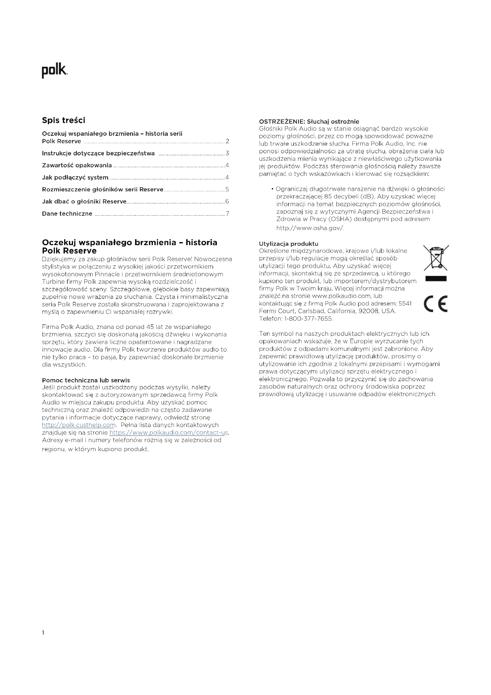 - Ograniczaj długotrwałe narażenie na dźwięki o głośności przekraczającej 85 decybeli (dB). Aby uzyskać więcej informacji na temat bezpiecznych poziomów głośności, zapoznaj się z wytycznymi Agencji Bezpieczeństwa i Zdrowia w Pracy (OSHA) dostępnymi pod adresem http://www.osha.gov/. Utylizacja produktu Określone międzynarodowe, krajowe i/lub lokalne przepisy i/lub regulacje mogą określać sposób utylizacji tego produktu. Aby uzyskać więcej informacji, skontaktuj się ze sprzedawcą, u którego kupiono ten produkt, lub importerem/dystrybutorem firmy Polk w Twoim kraju. Więcej informacji można znaleźć na stronie www.polkaudio.com, lub kontaktując się z firmą Polk Audio pod adresem: 5541 Fermi Court, Carlsbad, California, 92008, USA. Telefon: 1-800-377-7655. Ten symbol na naszych produktach elektrycznych lub ich opakowaniach wskazuje, że w Europie wyrzucanie tych produktów z odpadami komunalnymi jest zabronione. Aby zapewnić prawidłową utylizację produktów, prosimy o utylizowanie ich zgodnie z lokalnymi przepisami i wymogami prawa dotyczącymi utylizacji sprzętu elektrycznego i elektronicznego. Pozwala to przyczynić się do zachowania zasobów naturalnych oraz ochrony środowiska poprzez prawidłową utylizację i usuwanie odpadów elektronicznych. Oczekuj wspaniałego brzmienia – historia Polk Reserve Dziękujemy za zakup głośników serii Polk Reserve! Nowoczesna stylistyka w połączeniu z wysokiej jakości przetwornikiem wysokotonowym Pinnacle i przetwornikiem średniotonowym Turbine firmy Polk zapewnia wysoką rozdzielczość i szczegółowość sceny. Szczegółowe, głębokie basy zapewniają zupełnie nowe wrażenia ze słuchania. Czysta i minimalistyczna seria Polk Reserve została skonstruowana i zaprojektowana z myślą o zapewnieniu Ci wspaniałej rozrywki. Firma Polk Audio, znana od ponad 45 lat ze wspaniałego brzmienia, szczyci się doskonałą jakością dźwięku i wykonania sprzętu, który zawiera liczne opatentowane i nagradzane innowacje audio. Dla firmy Polk tworzenie produktów audio to nie tylko praca – to pasja, by zapewniać doskonałe brzmienie dla wszystkich. Pomoc techniczna lub serwis Jeśli produkt został uszkodzony podczas wysyłki, należy skontaktować się z autoryzowanym sprzedawcą firmy Polk Audio w miejscu zakupu produktu. Aby uzyskać pomoc techniczną oraz znaleźć odpowiedzi na często zadawane pytania i informacje dotyczące naprawy, odwiedź stronę http://polk.custhelp.com. Pełna lista danych kontaktowych znajduje się na stronie https://www.polkaudio.com/contact-us. Adresy e-mail i numery telefonów różnią się w zależności od regionu, w którym kupiono produkt.