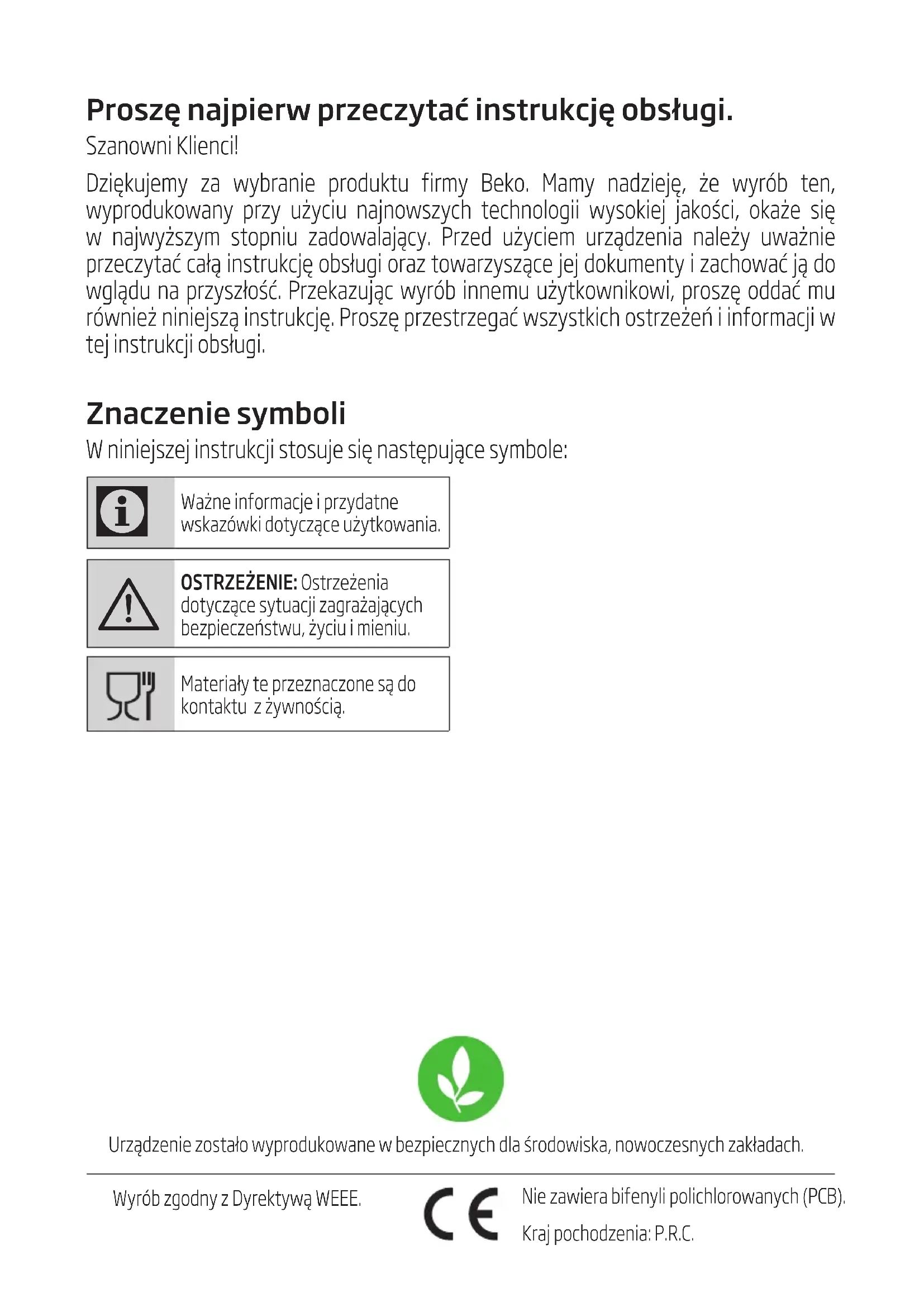 - Durante el manejo y el transporte, lleve el aparato en su embalaje original. El embalaje del aparato lo protege de daños físicos. • No coloque cargas pesadas en el aparato o en el embalaje. El aparato podría dañarse. • Dejar caer el aparato causará que éste no funcione o causará un daño permanente.Proszę najpierw przeczytać instrukcję obsługi. Szanown Klenc! Dzękujemy za wybrane produktu frmy Beko. Mamy nadzeję, że wyrób ten, wyprodukowany przy użycu najnowszych technolog wysokej jakośc, okaże sę w najwyższym stopnu zadowalający. Przed użycem urządzena należy uważne przeczytać całą nstrukcję obsług oraz towarzyszące jej dokumenty zachować ją do wglądu na przyszłość. Przekazując wyrób nnemu użytkownkow, proszę oddać mu równeż nnejszą nstrukcję. Proszę przestrzegać wszystkch ostrzeżeń nformacj w tej nstrukcj obsług. Znaczenie symboli W nnejszej nstrukcj stosuje sę następujące symbole: