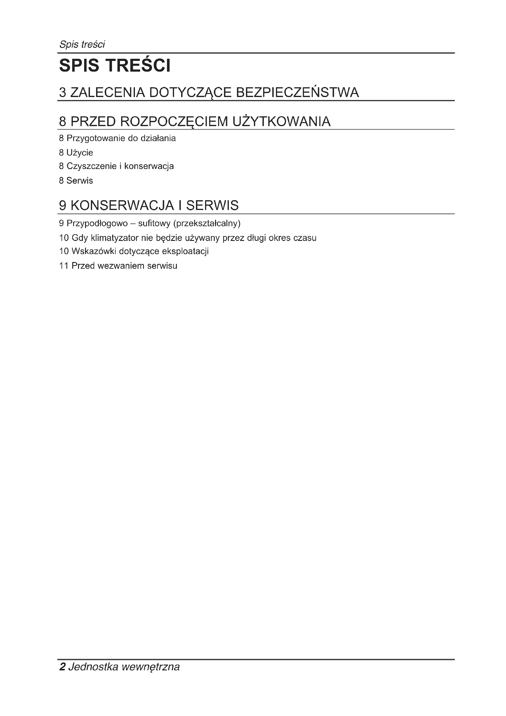 - Nie dotykać rury czynnika chłodniczego i rury wodnej ani żadnych wewnętrznych części podczas pracy urządzenia lub bezpośrednio po nim. - Może to spowodować poparzenie lub odmrożenie.Przed rozpoczęciem użytkowania 8 Jednostka wewnętrzna Skontaktuj się z autoryzowanym serwisem jeżeli zamierzasz przeprowadzić naprawę lub konserwację.