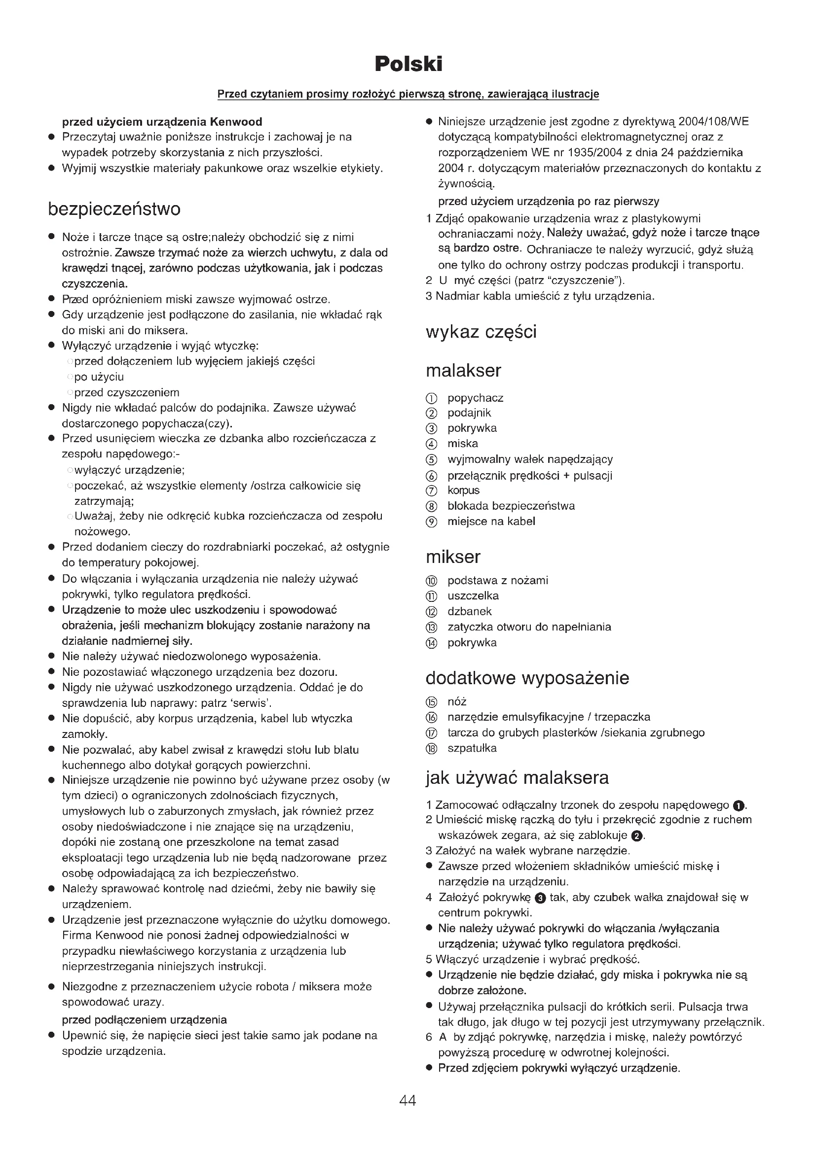 Niniejsze urządzenie jest zgodne z dyrektywą 2004/108/WE dotyczącą kompatybilności elektromagnetycznej oraz z rozporządzeniem WE nr 1935/2004 z dnia 24 października 2004 r. dotyczącym materiałów przeznaczonych do kontaktu z żywnością. pprrzzeedd uużżyycciieemm uurrzząąddzzeenniiaa ppoo rraazz ppiieerrwwsszzyy 1 Zdjąć opakowanie urządzenia wraz z plastykowymi ochraniaczami noży. NNaalleeżżyy uuwwaażżaaćć,, ggddyyżż nnoożżee ii ttaarrcczzee ttnnąąccee ssąą bbaarrddzzoo oossttrree.. Ochraniacze te należy wyrzucić, gdyż służą one tylko do ochrony ostrzy podczas produkcji i transportu. 2Umyć części (patrz “czyszczenie”). 3 Nadmiar kabla umieścić z tyłu urządzenia. wykaz części malakser popychacz podajnik pokrywka miska wyjmowalny wałek napędzający przełącznik prędkości + pulsacji korpus blokada bezpieczeństwa miejsce na kabel mikser podstawa z nożami uszczelka dzbanek zatyczka otworu do napełniania pokrywka dodatkowe wyposażenie nóż narzędzie emulsyfikacyjne / trzepaczka tarcza do grubych plasterków /siekania zgrubnego szpatułka jak używać malaksera 1 Zamocowaç od¢åczalny trzonek do zespo¢u napëdowego . 2 Umieścić miskę rączką do tyłu i przekręcić zgodnie z ruchem wskazówek zegara, aż się zablokuje . 3 Założyć na wałek wybrane narzędzie.