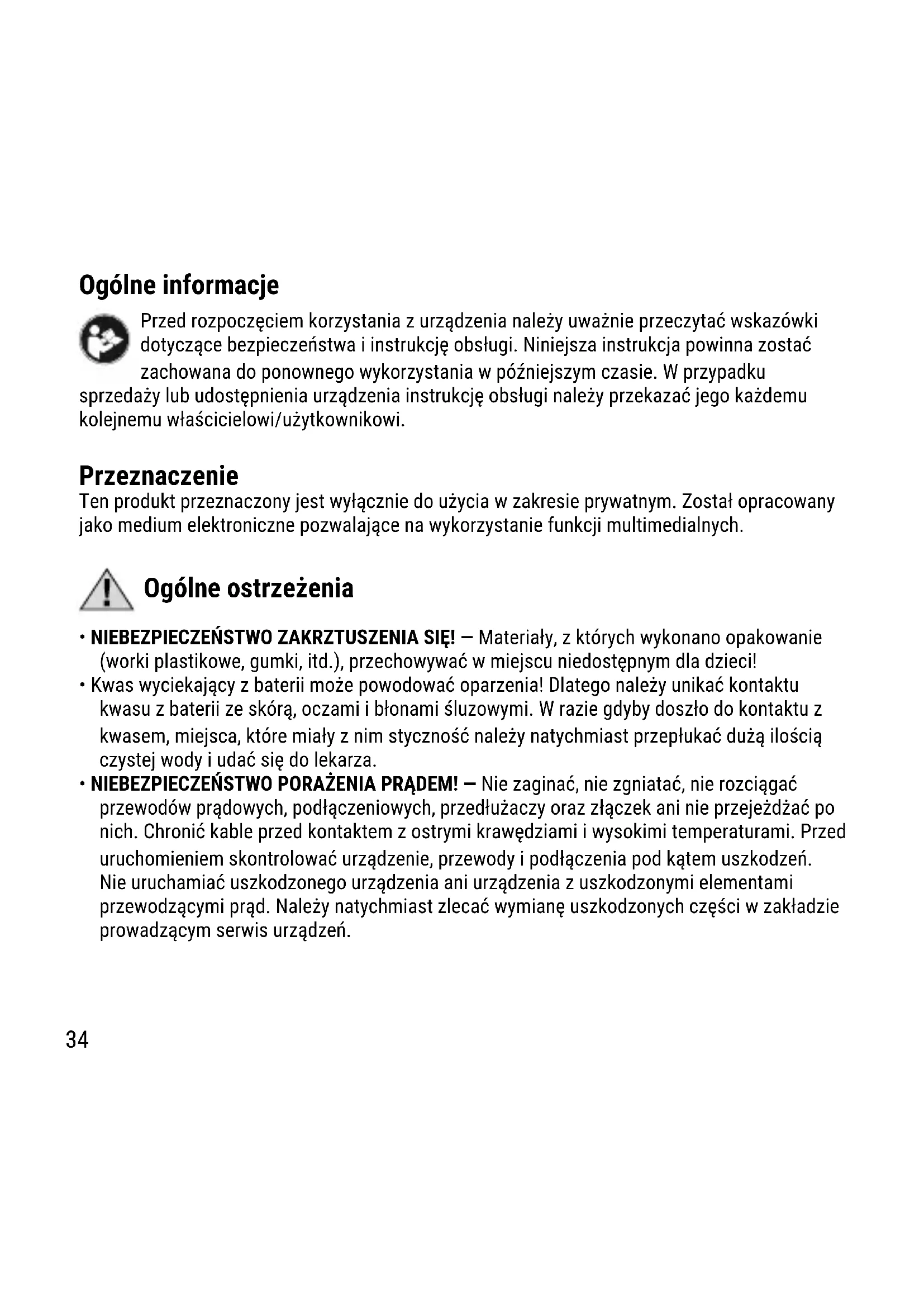 360° 360° F34 Ogólne informacje Przed rozpoczęciem korzystania z urządzenia należy uważnie przeczytać wskazówki dotyczące bezpieczeństwa i instrukcję obsługi. Niniejsza instrukcja powinna zostać zachowana do ponownego wykorzystania w późniejszym czasie. W przypadku sprzedaży lub udostępnienia urządzenia instrukcję obsługi należy przekazać jego każdemu kolejnemu właścicielowi/użytkownikowi. Przeznaczenie Ten produkt przeznaczony jest wyłącznie do użycia w zakresie prywatnym. Został opracowany jako medium elektroniczne pozwalające na wykorzystanie funkcji multimedialnych. Ogólne ostrzeżenia