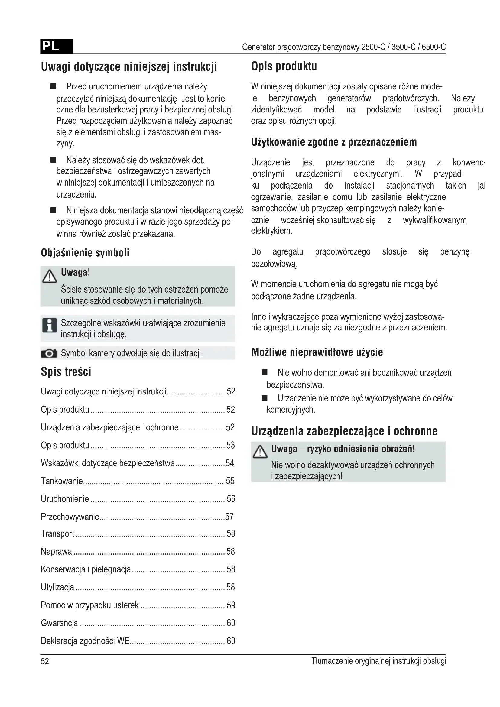 - Generator prądotwórczy benzynowy 2500-C / 3500-C / 6500-C Spis treści Uwagidotycząceniniejszejinstrukcji p. 52