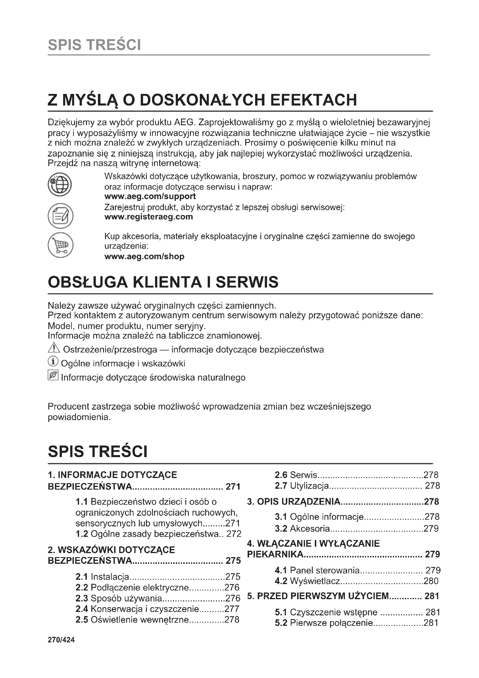 Recycleer de materialen met het symbool . Gooi de verpakking in een geschikte afvalcontainer om het te recycleren. Bescherm het milieu en de volksgezondheid en recycleer op een correcte manier het afval van elektrische en elektronische apparaten. Gooi apparaten gemarkeerd met het symbool niet weg met het huishoudelijk afval. Breng het product naar het milieustation bij u in de buurt of neem contact op met de gemeente. 269/424 HET IS HEEL GEMAKKELIJK!Z MYŚLĄ O DOSKONAŁYCH EFEKTACH Dziękujemy za wybór produktu AEG. Zaprojektowaliśmy go z myślą o wieloletniej bezawaryjnej pracy i wyposażyliśmy w innowacyjne rozwiązania techniczne ułatwiające życie – nie wszystkie z nich można znaleźć w zwykłych urządzeniach. Prosimy o poświęcenie kilku minut na zapoznanie się z niniejszą instrukcją, aby jak najlepiej wykorzystać możliwości urządzenia. Przejdź na naszą witrynę internetową: Wskazówki dotyczące użytkowania, broszury, pomoc w rozwiązywaniu problemów oraz informacje dotyczące serwisu i napraw: www.aeg.com/support Zarejestruj produkt, aby korzystać z lepszej obsługi serwisowej: www.registeraeg.com Kup akcesoria, materiały eksploatacyjne i oryginalne części zamienne do swojego urządzenia: www.aeg.com/shop