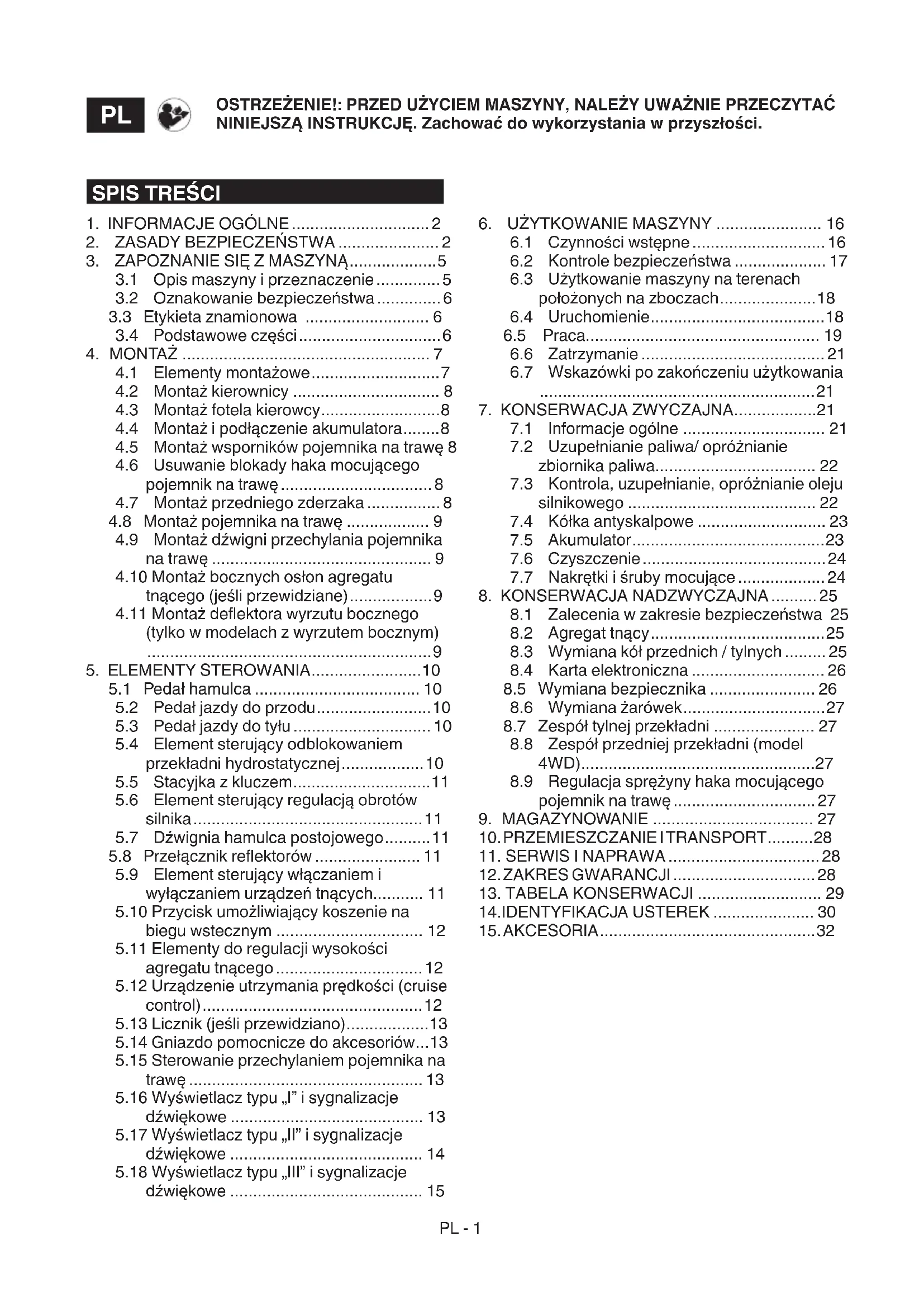 - Aby uniknąć ryzyka pożaru, nie należy pozostawiać maszyny w wysokiej trawie przy pracującym silniku.PL - 4 Sposób postępowania
