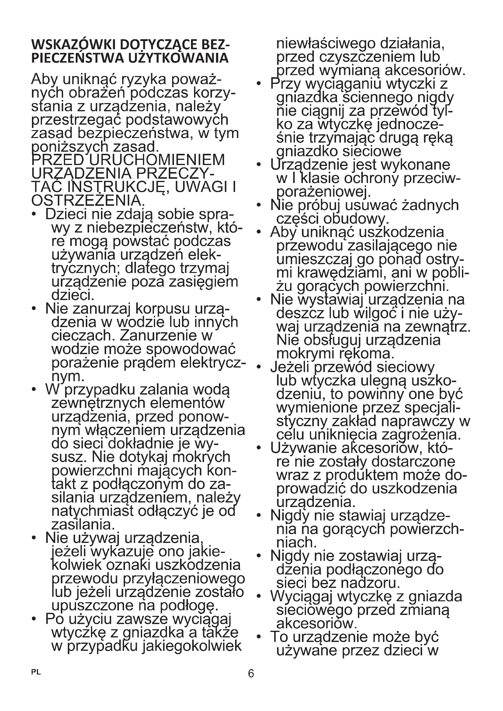 - Po użyciu zawsze wyciągaj wtyczkę z gniazdka a także w przypadku jakiegokolwiek niewłaściwego działania, przed czyszczeniem lub przed wymianą akcesoriów.