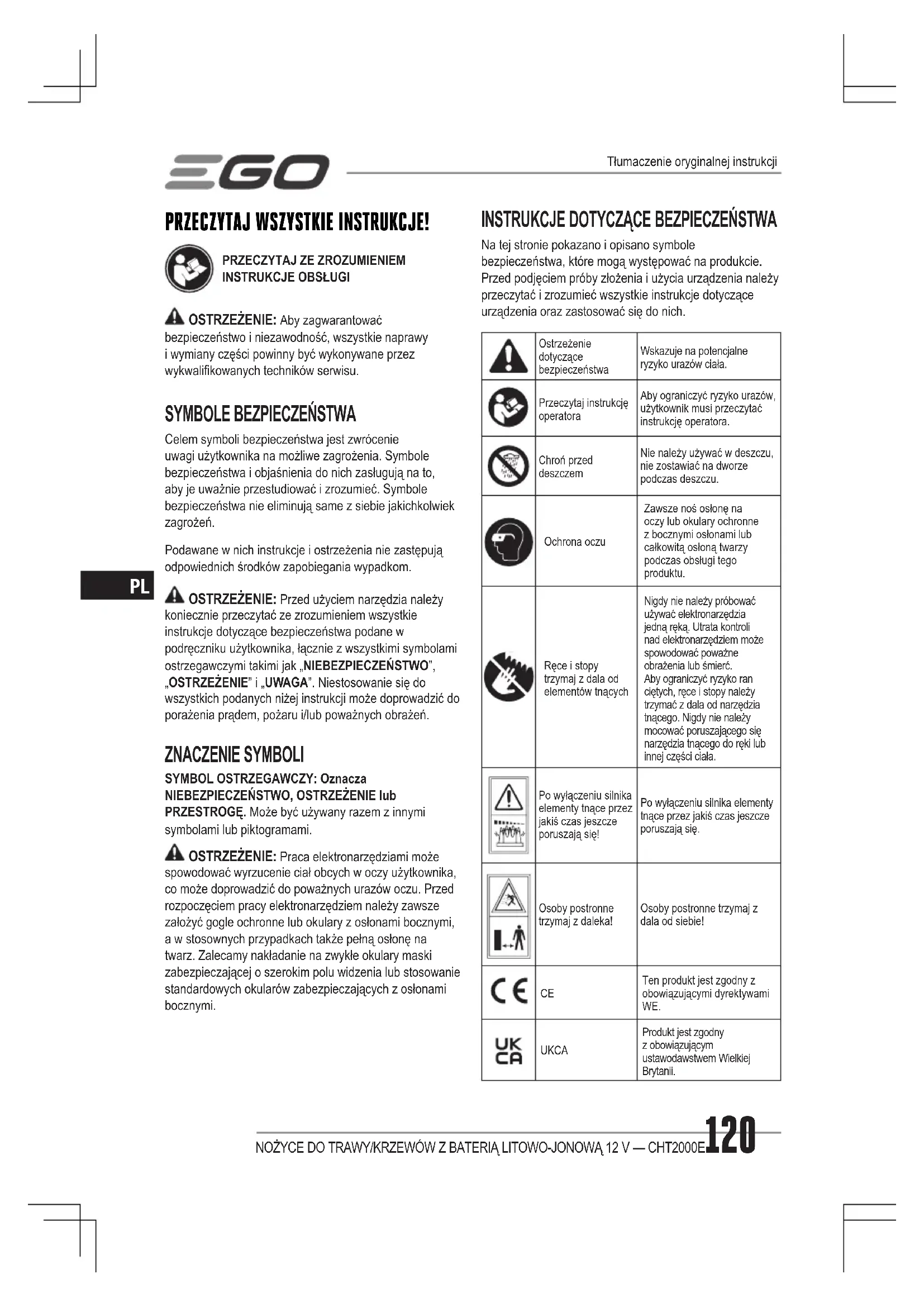 Na tej stronie pokazano i opisano symbole bezpieczeństwa, które mogą występować na produkcie. Przed podjęciem próby złożenia i użycia urządzenia należy przeczytać i zrozumieć wszystkie instrukcje dotyczące urządzenia oraz zastosować się do nich.Ostrzeżenie dotyczące bezpieczeństwaWskazuje na potencjalne ryzyko urazów ciała.Przeczytaj instrukcję operatoraAby ograniczyć ryzyko urazów, użytkownik musi przeczytać instrukcję operatora.Chroń przed deszczemNie należy używać w deszczu, nie zostawiać na dworze podczas deszczu.Ochrona oczuZawsze noś osłonę na oczy lub okulary ochronne z bocznymi osłonami lub całkowitą osłoną twarzy podczas obsługi tego produktu.Ręce i stopy trzymaj z dala od elementów tnącychNigdy nie należy próbować używać elektronarzędzia jedną ręką. Utrata kontroli nad elektronarzędziem może spowodować poważne obrażenia lub śmierć. Aby ograniczyć ryzyko ran ciętych, ręce i stopy należy trzymać z dala od narzędzia tnącego. Nigdy nie należy mocować poruszającego się narzędzia tnącego do ręki lub innej części ciała.Po wyłączeniu silnika elementy tnące przez jakiś czas jeszcze poruszają się!Po wyłączeniu silnika elementy tnące przez jakiś czas jeszcze poruszają się.Osoby postronne trzymaj z daleka!Osoby postronne trzymaj z dala od siebie! Ten produkt jest zgodny z obowiązującymi dyrektywami WE. UKCA Produkt jest zgodny z obowiązującym ustawodawstwem Wielkiej Brytanii.Tłumaczenie oryginalnej instrukcjiNOŻYCE DO TRAWY/KRZEWÓW Z BATERIĄ LITOWO-JONOWĄ 12 V — CHT2000E 121