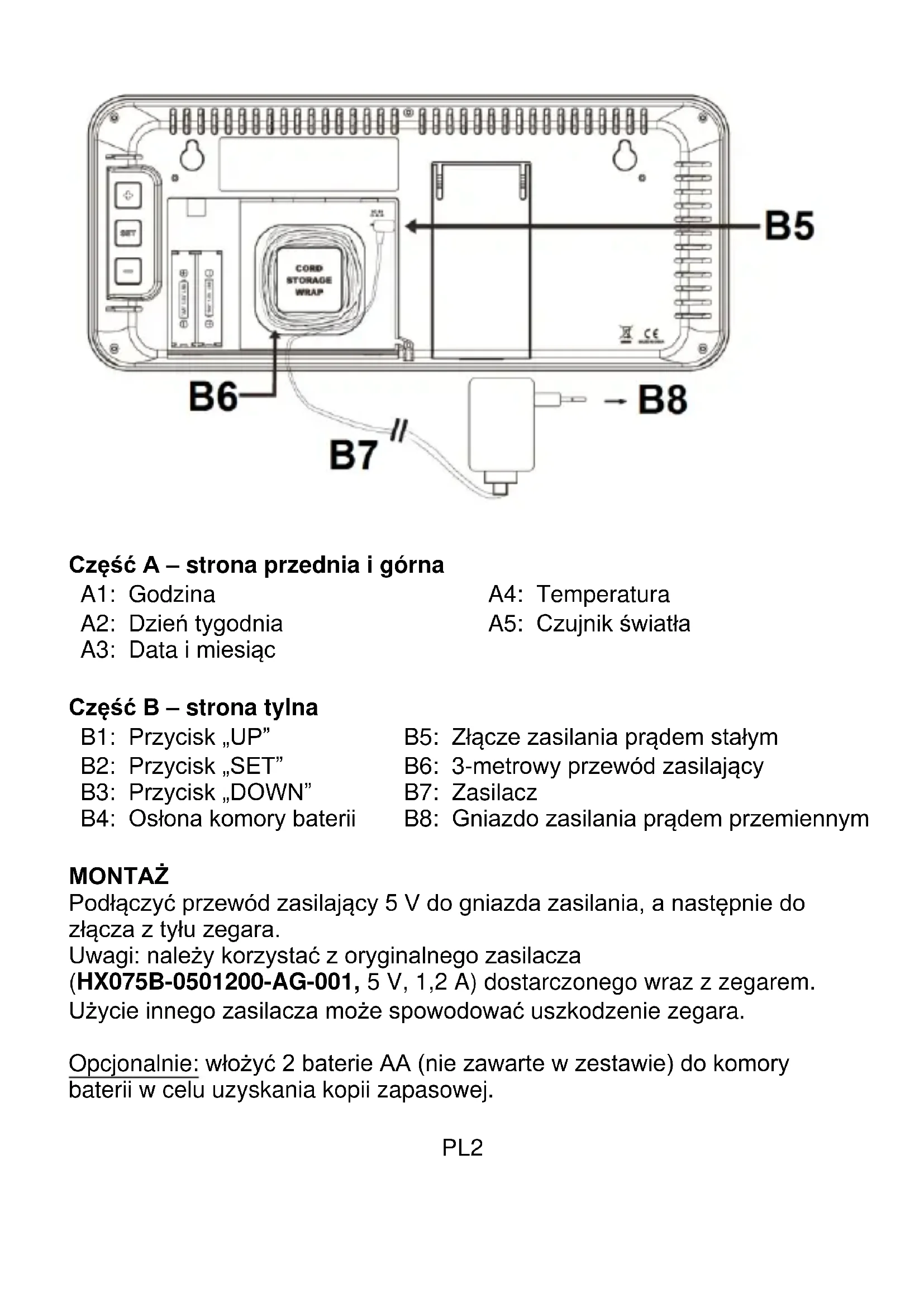 Część B – strona tylna B1: Przycisk „UP” B2: Przycisk „SET” B3: Przycisk „DOWN” B4: Osłona komory baterii B5: Złącze zasilania prądem stałym B6: 3-metrowy przewód zasilający B7: Zasilacz B8: Gniazdo zasilania prądem przemiennym