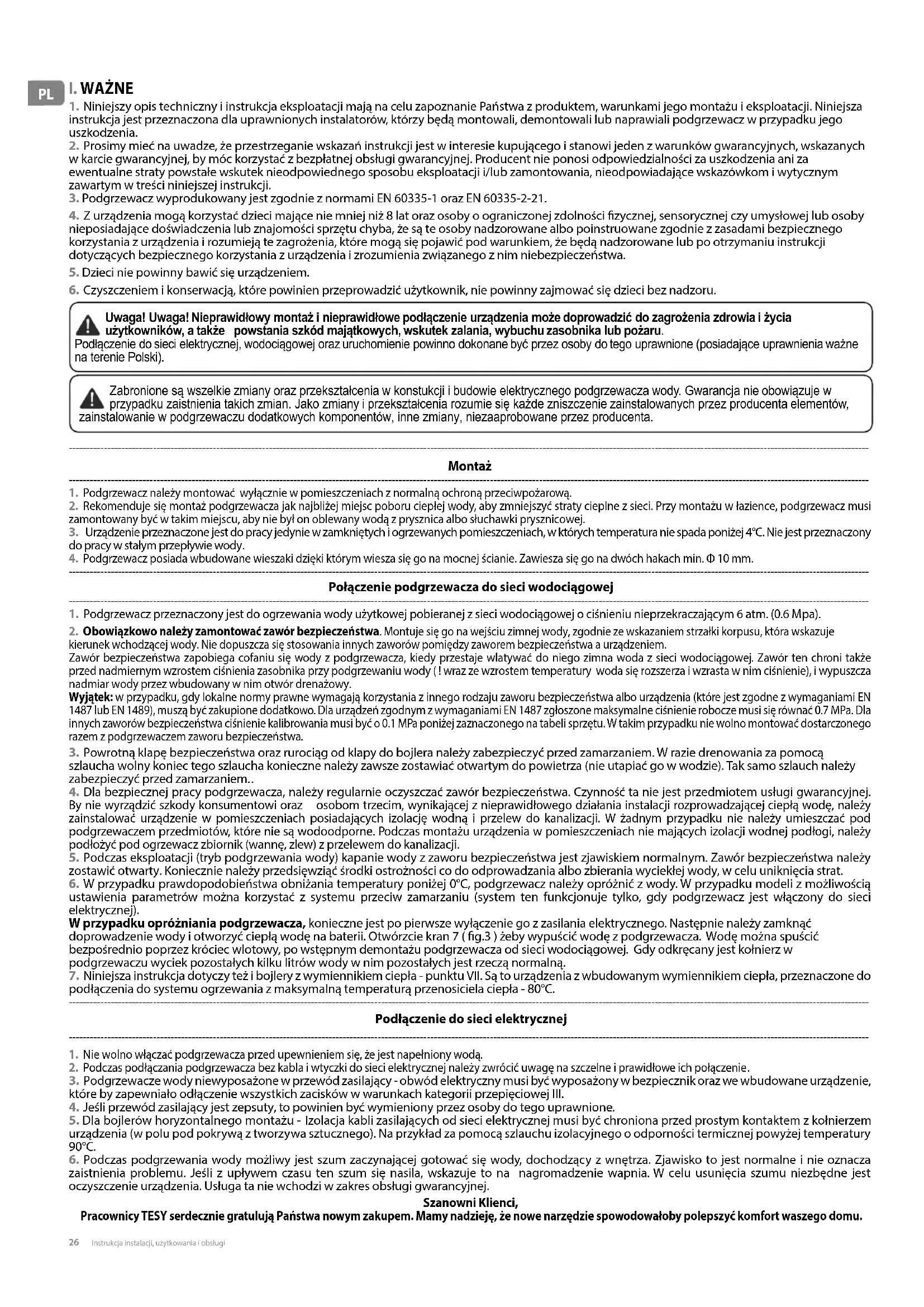 Uwaga! Uwaga! Nieprawidłowy montaż i nieprawidłowe podłączenie urządzenia może doprowadzić do zagrożenia zdrowia i życia użytkowników, a także powstania szkód majątkowych, wskutek zalania, wybuchu zasobnika lub pożaru. Podłączenie do sieci elektrycznej, wodociągowej oraz uruchomienie powinno dokonane być przez osoby do tego uprawnione (posiadające uprawnienia ważne na terenie Polski). Zabronione są wszelkie zmiany oraz przekształcenia w konstukcji i budowie elektrycznego podgrzewacza wody. Gwarancja nie obowiązuje w przypadku zaistnienia takich zmian. Jako zmiany i przekształcenia rozumie się każde zniszczenie zainstalowanych przez producenta elementów, zainstalowanie w podgrzewaczu dodatkowych komponentów, inne zmiany, niezaaprobowane przez producenta.