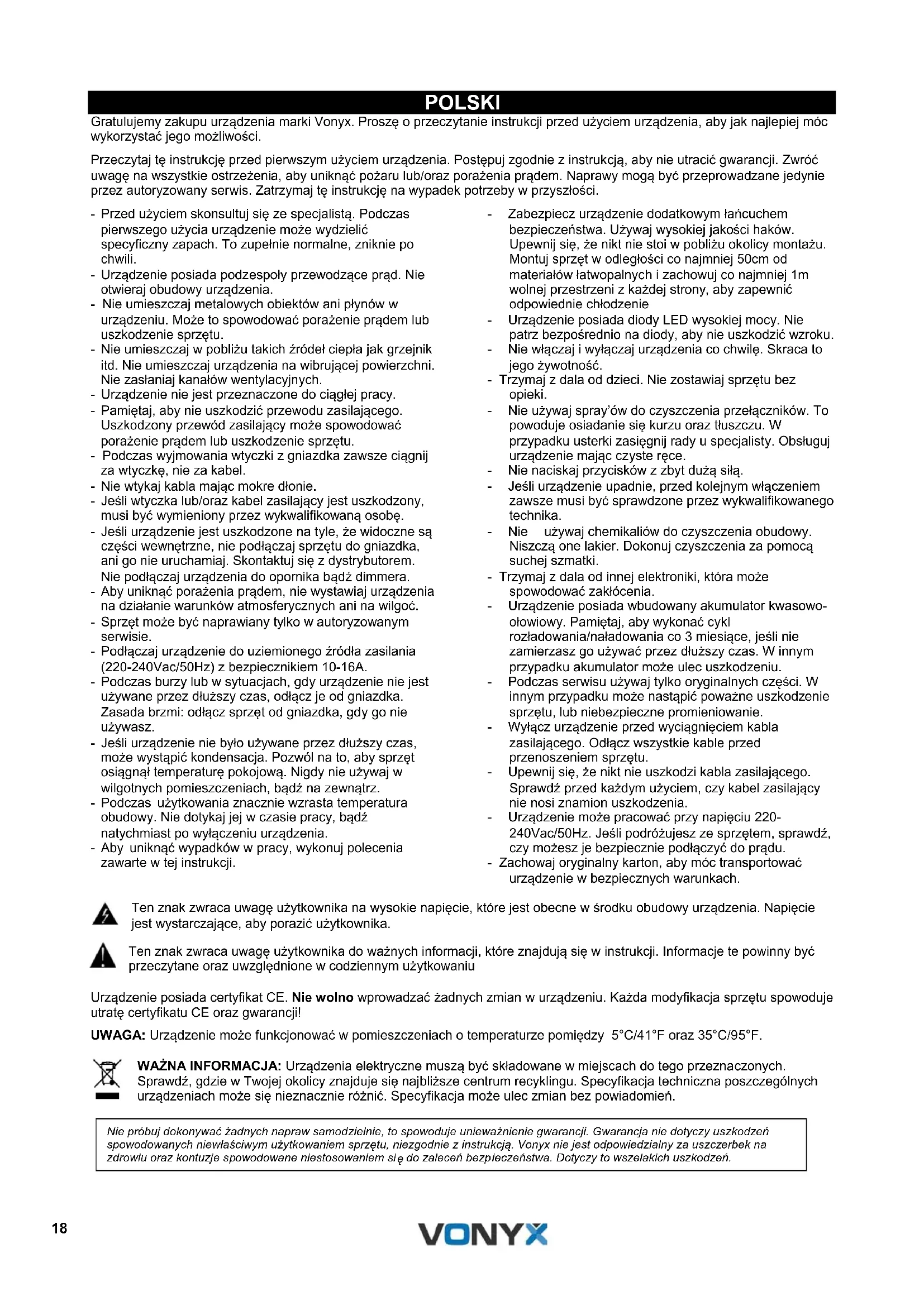 Si le fusible est défectueux, remplacez-le par un fusible de même type et de même valeur. Avant de remplacer le fusible, veillez à débrancher l'appareil du secteur. Procédure: Etape 1: Ouvrez le porte-fusible sur la face arrière de l'appareil avec un petit tournevis. Etape 2: Retirez l'ancien fusible du support. Etape 3: Installez le nouveau fusible. Etape 4: Replacez le support dans le boîtier.18 POLSKI Gratulujemy zakupu urządzenia marki Vonyx. Proszę o przeczytanie instrukcji przed użyciem urządzenia, aby jak najlepiej móc wykorzystać jego możliwości. Przeczytaj tę instrukcję przed pierwszym użyciem urządzenia. Postępuj zgodnie z instrukcją, aby nie utracić gwarancji. Zwróć uwagę na wszystkie ostrzeżenia, aby uniknąć pożaru lub/oraz porażenia prądem. Naprawy mogą być przeprowadzane jedynie przez autoryzowany serwis. Zatrzymaj tę instrukcję na wypadek potrzeby w przyszłości. - Przed użyciem skonsultuj się ze specjalistą. Podczas pierwszego użycia urządzenie może wydzielić specyficzny zapach. To zupełnie normalne, zniknie po chwili. - Urządzenie posiada podzespoły przewodzące prąd. Nie otwieraj obudowy urządzenia. - Nie umieszczaj metalowych obiektów ani płynów w urządzeniu. Może to spowodować porażenie prądem lub uszkodzenie sprzętu. - Nie umieszczaj w pobliżu takich źródeł ciepła jak grzejnik itd. Nie umieszczaj urządzenia na wibrującej powierzchni. Nie zasłaniaj kanałów wentylacyjnych. - Urządzenie nie jest przeznaczone do ciągłej pracy. - Pamiętaj, aby nie uszkodzić przewodu zasilającego. Uszkodzony przewód zasilający może spowodować porażenie prądem lub uszkodzenie sprzętu. - Podczas wyjmowania wtyczki z gniazdka zawsze ciągnij za wtyczkę , nie za kabel. - Nie wtykaj kabla mając mokre dłonie. - Jeśli wtyczka lub/oraz kabel zasilający jest uszkodzony, musi być wymieniony przez wykwalifikowaną osobę. - Jeśli urządzenie jest uszkodzone na tyle, że widoczne są części wewnętrzne, nie podłączaj sprzętu do gniazdka, ani go nie uruchamiaj. Skontaktuj się z dystrybutorem. Nie podłączaj urządzenia do opornika bądź dimmera. - Aby uniknąć porażenia prądem, nie wystawiaj urządzenia na działanie warunków atmosferycznych ani na wilgoć. - Sprzęt może być naprawiany tylko w autoryzowanym serwisie. - Podłączaj urządzenie do uziemionego źródła zasilania (220-240Vac/50Hz) z bezpiecznikiem 10-16A. - Podczas burzy lub w sytuacjach, gdy urządzenie nie jest używane przez dłuższy czas, odłącz je od gniazdka. Zasada brzmi: odłącz sprzęt od gniazdka, gdy go nie używasz. - Jeśli urządzenie nie było używane przez dłuższy czas, może wystąpić kondensacja. Pozwól na to, aby sprzęt osiągnął temperaturę pokojową. Nigdy nie używaj w wilgotnych pomieszczeniach, bądź na zewnątrz. - Podczas użytkowania znacznie wzrasta temperatura obudowy. Nie dotykaj jej w czasie pracy, bądź natychmiast po wyłączeniu urządzenia. - Aby uniknąć wypadków w pracy, wykonuj polecenia zawarte w tej instrukcji. - Zabezpiecz urządzenie dodatkowym łańcuchem bezpieczeństwa. Używaj wysokiej jakości haków. Upewnij się, że nikt nie stoi w pobliżu okolicy montażu. Montuj sprzęt w odległości co najmniej 50cm od materiałów łatwopalnych i zachowuj co najmniej 1m wolnej przestrzeni z każdej strony, aby zapewnić odpowiednie chłodzenie - Urządzenie posiada diody LED wysokiej mocy. Nie patrz bezpośrednio na diody, aby nie uszkodzić wzroku. - Nie włączaj i wyłączaj urządzenia co chwilę. Skraca to jego żywotność. - Trzymaj z dala od dzieci. Nie zostawiaj sprzętu bez opieki. - Nie używaj spray’ów do czyszczenia przełączników. To powoduje osiadanie się kurzu oraz tłuszczu. W przypadku usterki zasięgnij rady u specjalisty. Obsługuj urządzenie mając czyste ręce. - Nie naciskaj przycisków z zbyt dużą siłą. - Jeśli urządzenie upadnie, przed kolejnym włączeniem zawsze musi być sprawdzone przez wykwalifikowanego technika. - Nie używaj chemikaliów do czyszczenia obudowy. Niszczą one lakier. Dokonuj czyszczenia za pomocą suchej szmatki. - Trzymaj z dala od innej elektroniki, która może spowodować zakłócenia. - Urządzenie posiada wbudowany akumulator kwasowo- ołowiowy. Pamiętaj, aby wykonać cykl rozładowania/naładowania co 3 miesiące, jeśli nie zamierzasz go używać przez dłuższy czas. W innym przypadku akumulator może ulec uszkodzeniu. - Podczas serwisu używaj tylko oryginalnych części. W innym przypadku może nastąpić poważne uszkodzenie sprzętu, lub niebezpieczne promieniowanie. - Wyłącz urządzenie przed wyciągnięciem kabla zasilającego. Odłącz wszystkie kable przed przenoszeniem sprzętu. - Upewnij się, że nikt nie uszkodzi kabla zasilającego. Sprawdź przed każdym użyciem, czy kabel zasilający nie nosi znamion uszkodzenia. - Urządzenie może pracować przy napięciu 220- 240Vac/50Hz. Jeśli podróżujesz ze sprzętem, sprawdź, czy możesz je bezpiecznie podłączyć do prądu. - Zachowaj oryginalny karton, aby móc transportować urządzenie w bezpiecznych warunkach. Ten znak zwraca uwagę użytkownika na wysokie napię cie, które jest obecne w środku obudowy urządzenia. Napięcie jest wystarczające, aby porazić użytkownika.