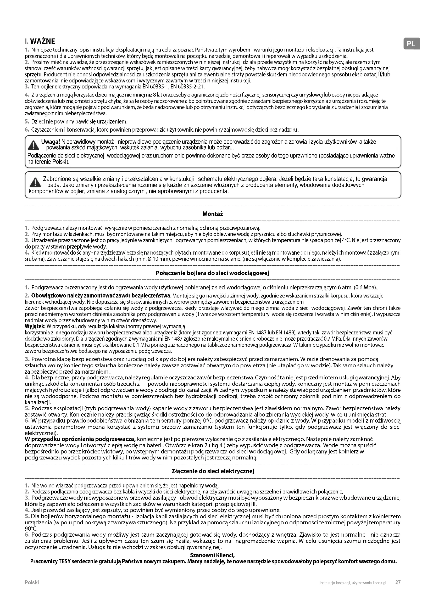 Izolacja kabli zasilających od sieci elektrycznej musi być chroniona przed prostym kontaktem z kołnierzem urządzenia (w polu pod pokrywą z tworzywa sztucznego). Na przykład za pomocą szlauchu izolacyjnego o odporności termicznej powyżej temperatury 90°C. 6. Podczas podgrzewania wody możliwy jest szum zaczynającej gotować się wody, dochodzący z wnętrza. Zjawisko to jest normalne i nie oznacza zaistnienia problemu. Jeśli z upływem czasu ten szum się nasila, wskazuje to na nagromadzenie wapnia. W celu usunięcia szumu niezbędne jest oczyszczenie urządzenia. Usługa ta nie wchodzi w zakres obsługi gwarancyjnej. Szanowni Klienci, Pracownicy TESY serdecznie gratulują Państwa nowym zakupem. Mamy nadzieję, że nowe narzędzie spowodowałoby polepszyć komfort waszego domu.28 Instrukcja instalacji, użytkowania i obsługi