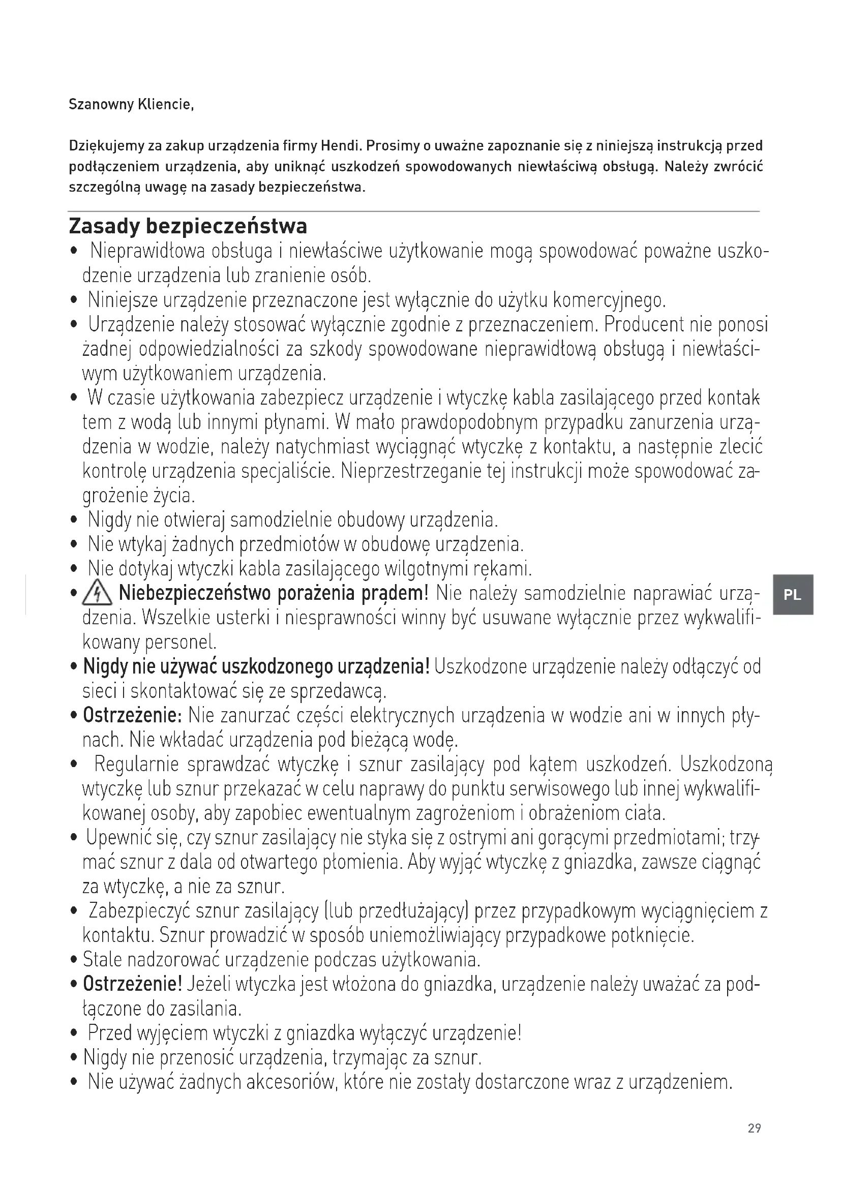 Szanowny Kliencie, Dziękujemy za zakup urządzenia firmy Hendi. Prosimy o uważne zapoznanie się z niniejszą instrukcją przed podłączeniem urządzenia, aby uniknąć uszkodzeń spowodowanych niewłaściwą obsługą. Należy zwrócić szczególną uwagę na zasady bezpieczeństwa. Zasady bezpieczeństwa