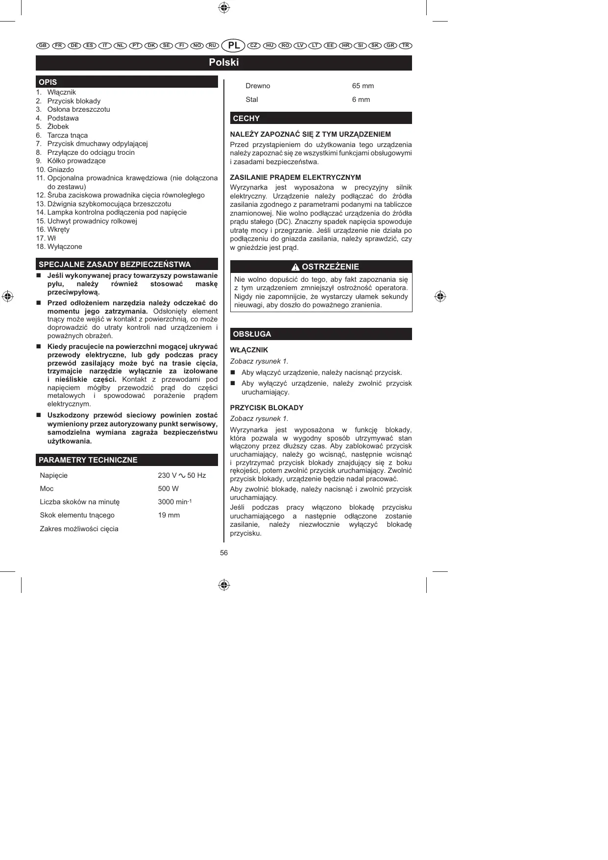 OSTRZE¢ENIE Jeli wykonywanej pracy towarzyszy powstawanie pyu, naley równie stosowa mask przeciwpyow. Nie wolno dopu§ci¨ do tego, aby fakt zapoznania si£ z tym urz¡dzeniem zmniejszy ostro¦no§¨ operatora. Nigdy nie zapomnijcie, ¦e wystarczy u amek sekundy nieuwagi, aby dosz o do powa¦nego zranienia. Przed odoeniem narzdzia naley odczeka do momentu jego zatrzymania. Ods oni£ty element tn¡cy mo¦e wej§¨ w kontakt z powierzchni¡, co mo¦e doprowadzi¨ do utraty kontroli nad urz¡dzeniem i powa¦nych obra¦e©. OBSUGA Kiedy pracujecie na powierzchni mogcej ukrywa przewody elektryczne, lub gdy podczas pracy przewód zasilajcy moe by na trasie cicia, trzymajcie narzdzie wycznie za izolowane i nieliskie czci. Kontakt z przewodami pod napi£ciem móg by przewodzi¨ pr¡d do cz£§ci metalowych i spowodowa¨ pora¦enie pr¡dem elektrycznym. W¥CZNIK Zobacz rysunek 1. Aby w ¡czy¨ urz¡dzenie, nale¦y nacisn¡¨ przycisk. Aby wy ¡czy¨ urz¡dzenie, nale¦y zwolni¨ przycisk uruchamiaj¡cy. PRZYCISK BLOKADY Uszkodzony przewód sieciowy powinien zosta wymieniony przez autoryzowany punkt serwisowy, samodzielna wymiana zagraa bezpiecze stwu uytkowania. Zobacz rysunek 1. Wyrzynarka jest wyposa¦ona w funkcj£ blokady, która pozwala w wygodny sposób utrzymywa¨ stan w ¡czony przez d u¦szy czas. Aby zablokowa¨ przycisk uruchamiaj¡cy, nale¦y go wcisn¡¨, nast£pnie wcisn¡¨ i przytrzyma¨ przycisk blokady znajduj¡cy si£ z boku r£koje§ci, potem zwolni¨ przycisk uruchamiaj¡cy. Zwolni¨ przycisk blokady, urz¡dzenie b£dzie nadal pracowa¨. Aby zwolni¨ blokad£, nale¦y nacisn¡¨ i zwolni¨ przycisk uruchamiaj¡cy. Je§li podczas pracy w ¡czono blokad£ przycisku uruchamiaj¡cego a nast£pnie od ¡czone zostanie zasilanie, nale¦y niezw ocznie wy ¡czy¨ blokad£ przycisku. PARAMETRY TECHNICZNE Napi£cie 230 V Moc 500 W 50 Hz Liczba skoków na minut£ 3000 min-1 Skok elementu tn¡cego 19 mm Zakres mo¦liwo§ci ci£cia