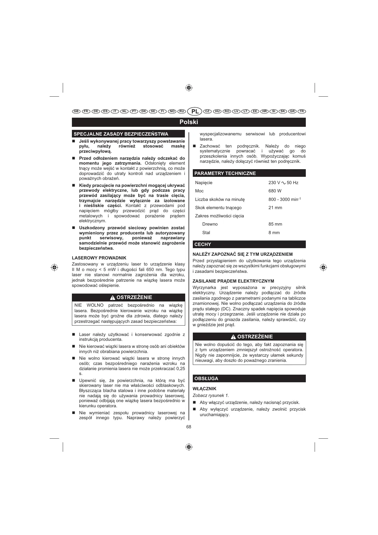 Wyrzynarka jest wyposa¨ona w precyzyjny silnik elektryczny. Urz§dzenie nale¨y pod¥§czaª do ¬ród¥a zasilania zgodnego z parametrami podanymi na tabliczce znamionowej. Nie wolno pod¥§czaª urz§dzenia do ¬ród¥a pr§du sta¥ego (DC). Znaczny spadek napi¦cia spowoduje utrat¦ mocy i przegrzanie. Je©li urz§dzenie nie dzia¥a po pod¥§czeniu do gniazda zasilania, nale¨y sprawdziª, czy w gnie¬dzie jest pr§d. OSTRZE¦ENIE NIE WOLNO patrzeª bezpo©rednio na wi§zk¦ lasera. Bezpo©rednie kierowanie wzroku na wi§zk¦ lasera mo¨e byª gro¬ne dla zdrowia, dlatego nale¨y przestrzegaª nast¦puj§cych zasad bezpiecze«stwa: Laser nale¨y u¨ytkowaª i konserwowaª zgodnie z instrukcj§ producenta. OSTRZE¦ENIE Nie wolno dopu©ciª do tego, aby fakt zapoznania si¦ z tym urz§dzeniem zmniejszy¥ ostro¨no©ª operatora. Nigdy nie zapomnijcie, ¨e wystarczy u¥amek sekundy nieuwagi, aby dosz¥o do powa¨nego zranienia. Nie kierowaª wi§zki lasera w stron¦ osób ani obiektów innych ni¨ obrabiana powierzchnia. Nie wolno kierowaª wi§zki lasera w stron¦ innych osób; czas bezpo©redniego nara¨enia wzroku na dzia¥anie promienia lasera nie mo¨e przekraczaª 0,25