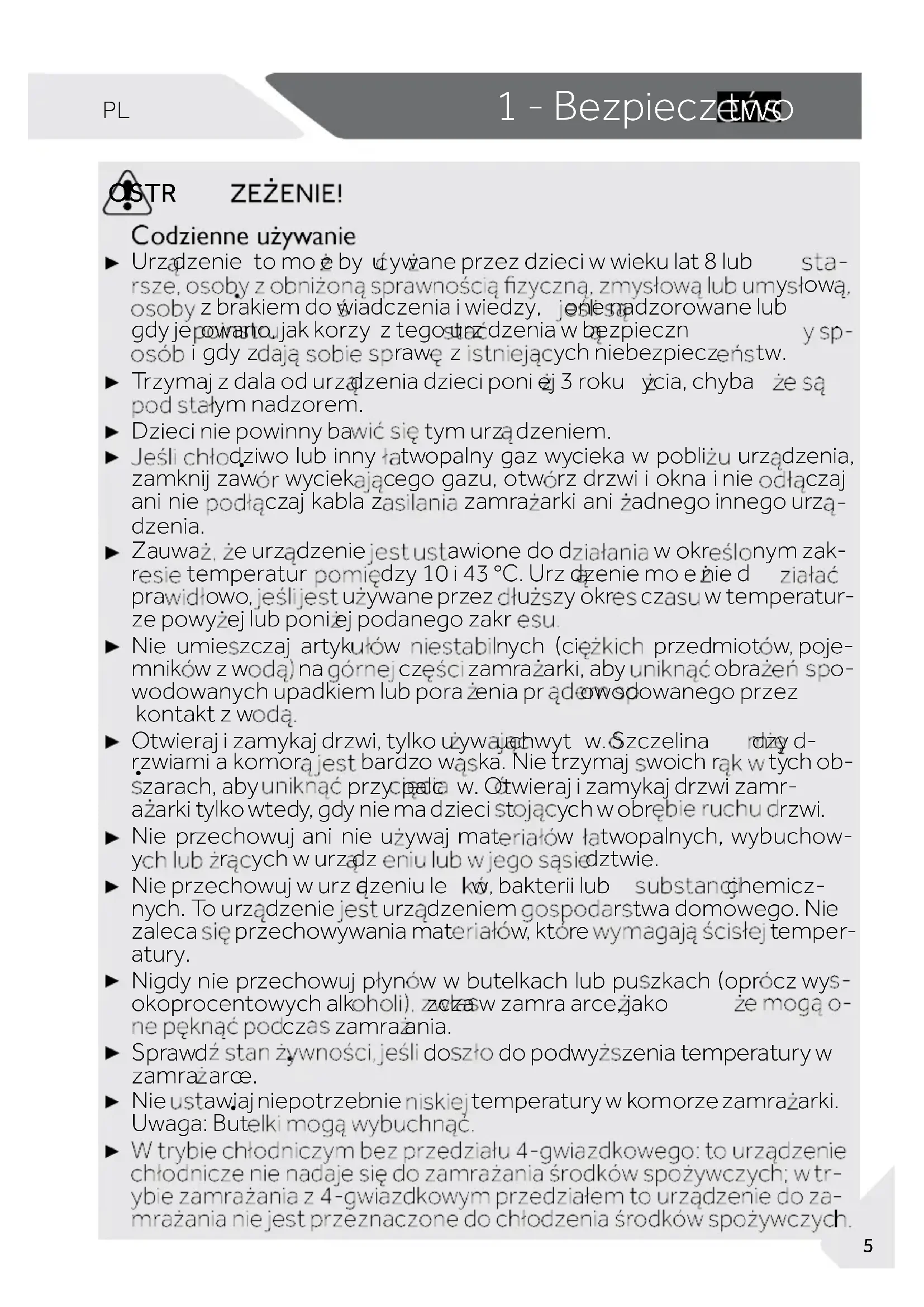 twieraj i zamykaj drzwi, tylko u yw uchwyt w. Szczelina dzy d- rzwiami a komor bardzo w ka. Nie trzymaj woich r tych ob- zarach, aby przy palc w. Otwieraj i zamykaj drzwi zamr- a arki tylko wtedy, gdy nie ma dzieci t ych w obr rzwi. Nie przechowuj ani nie u ywaj mat w twopalnych, wybuchow- y r ych w urz dz dztwie. Nie przechowuj w urz dzeniu le w, bakterii lub chemicz- nych. To urz dzenie urz dzeniem r twa domowego. Nie zaleca przechowywania mat w, kt re temper- atury. Nigdy nie przechowuj p yn w w butelkach lub pu zkach (opr cz wy okoprocentowych alk zcza w zamra arce, jako