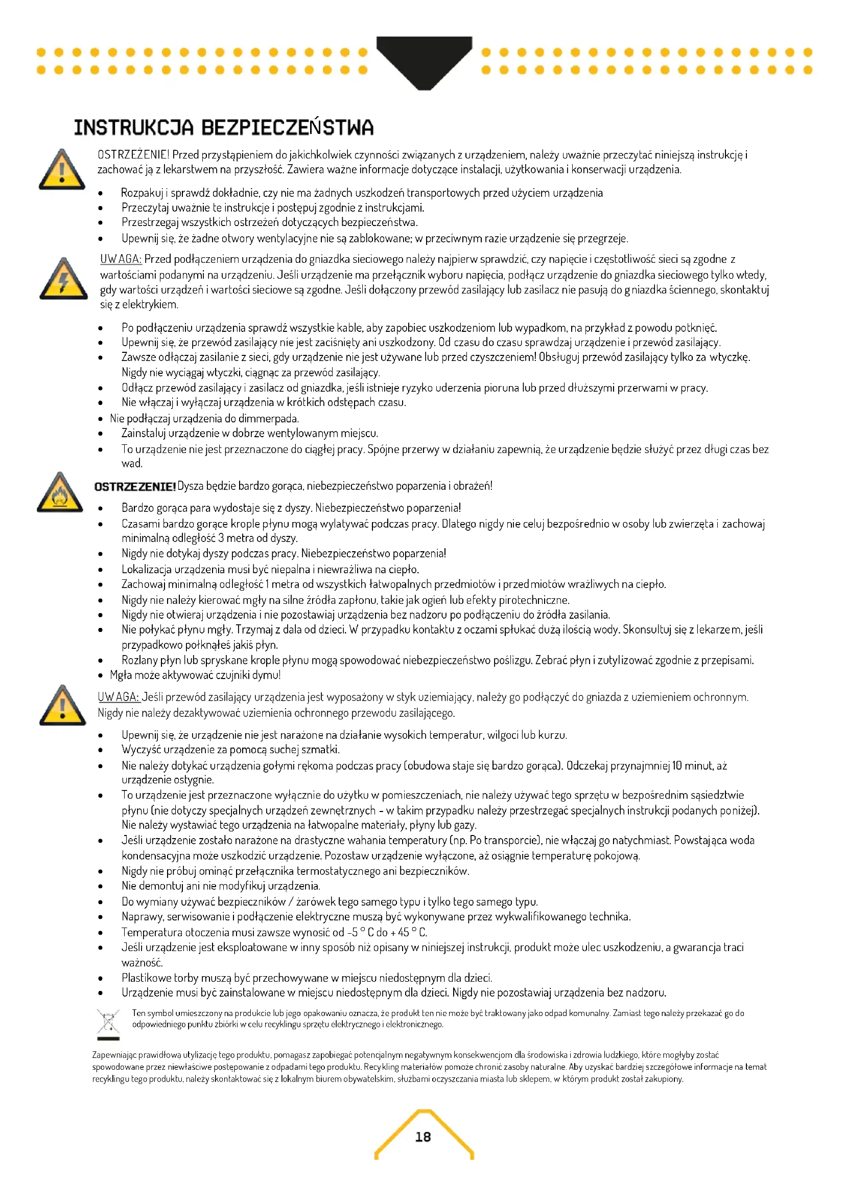 - Urządzenie musi być zainstalowane w miejscu niedostępnym dla dzieci. Nigdy nie pozostawiaj urządzenia bez nadzoru. Ten symbol umieszczony na produkcie lub jego opakowaniu oznacza, że produkt ten nie może być traktowany jako odpad komunalny. Zamiast tego należy przekazać go do odpowiedniego punktu zbiórki w celu recyklingu sprzętu elektrycznego i elektronicznego.