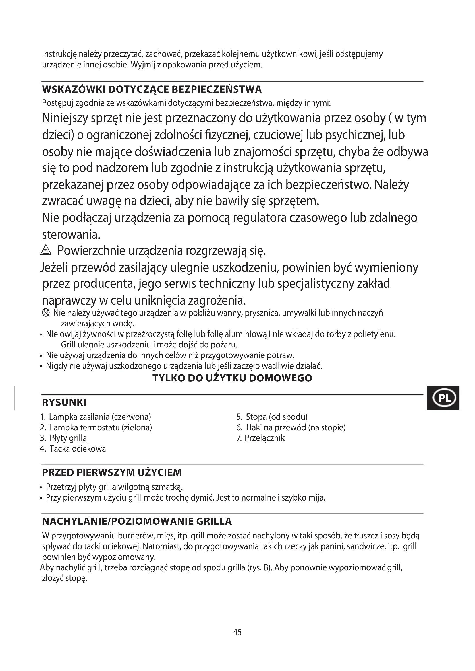 Postępuj zgodnie ze wskazówkami dotyczącymi bezpieczeństwa, między innymi: Niniejszy sprzęt nie jest przeznaczony do użytkowania przez osoby ( w tym dzieci) o ograniczonej zdolności zycznej, czuciowej lub psychicznej, lub osoby nie mające doświadczenia lub znajomości sprzętu, chyba że odbywa się to pod nadzorem lub zgodnie z instrukcją użytkowania sprzętu, przekazanej przez osoby odpowiadające za ich bezpieczeństwo. Należy zwracać uwagę na dzieci, aby nie bawiły się sprzętem. Nie podłączaj urządzenia za pomocą regulatora czasowego lub zdalnego sterowania. ¬ Powierzchnie urządzenia rozgrzewają się. Jeżeli przewód zasilający ulegnie uszkodzeniu, powinien być wymieniony przez producenta, jego serwis techniczny lub specjalistyczny zakład naprawczy w celu uniknięcia zagrożenia. b Nie należy używać tego urządzenia w pobliżu wanny, prysznica, umywalki lub innych naczyń zawierających wodę.