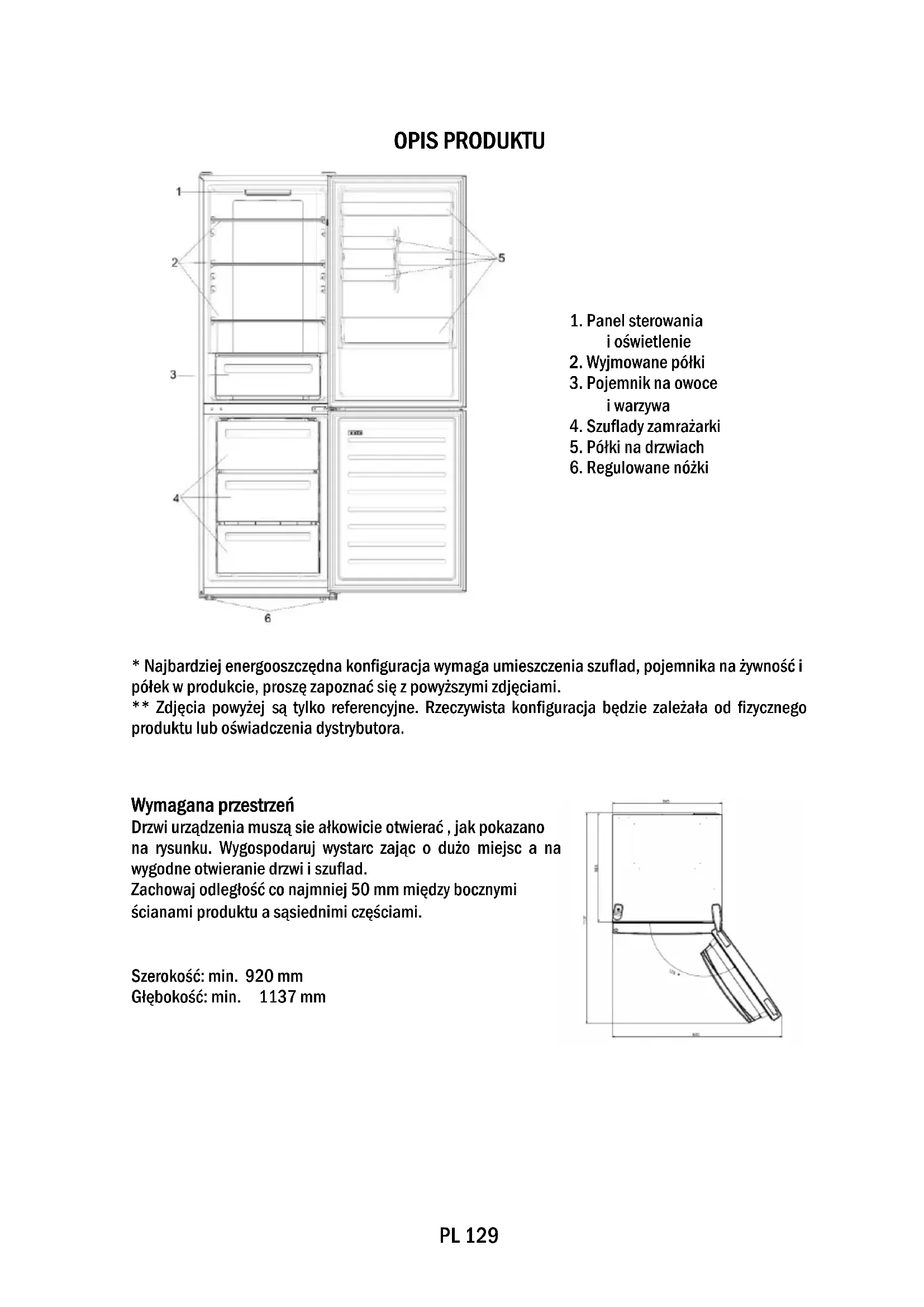 - Najbardziej energooszczędna konfiguracja wymaga umieszczenia szuflad, pojemnika na żywność i półek w produkcie, proszę zapoznać się z powyższymi zdjęciami. ** Zdjęcia powyżej są tylko referencyjne. Rzeczywista konfiguracja będzie zależała od fizycznego produktu lub oświadczenia dystrybutora. Wymagana przestrzeń Drzwi urządzenia muszą sie ałkowicie otwierać , jak pokazano na rysunku. Wygospodaruj wystarc zając o dużo miejsc a na wygodne otwieranie drzwi i szuflad. Zachowaj odległość co najmniej 50 mm między bocznymi ścianami produktu a sąsiednimi częściami. Szerokość: min. 920 mm Głębokość: min. 1137 mmPL 130 UŻYTKOWANIE ➀ Przycisk WŁ./WYŁ. służy do włączania/wyłączania urządzenia. ➁ Przycisk Mode służy do wyboru temperatury w lodówce lub funkcji specjalnych. ➂ Ikona Wi-Fi pokazuje, czy urządzenie jest połączone z aplikacją. ➃ Ikona Super Cool pokazuje, czy funkcja jest aktywna. ➄ Poziomy temperatury pokazują, która temperatura jest wybrana. Użytkowanie