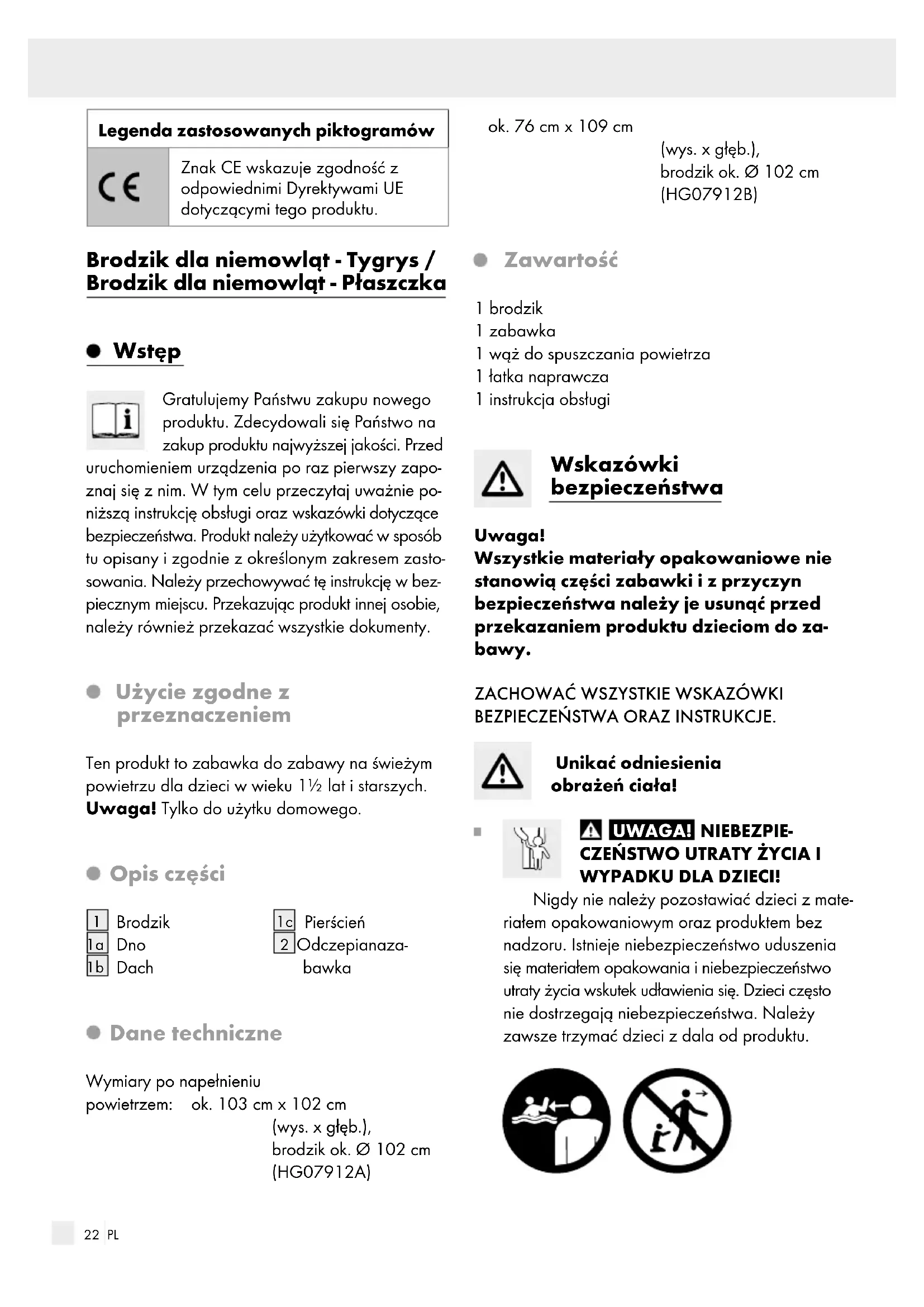 apełniać produkt wodą powoli i nie pozostawiać go bez nadzoru podczas napełniania. Wskazówka: napełnić produkt najwyżej do wydrukowanej kreski. Opróżnianie produktu Opróżnić produkt. Wskazówka: należy przestrzegać lokalnych przepisów dotyczących usuwania wody z ba- senów. Demontaż produktu Przed złożeniem pozostawić produkt, aby całkowicie wysechł. Zdjąć wszystkie odczepiane części. Wypuszczanie powietrza z produktu Wyciągnąć zawór i lekko nacisnąć na trzpień zaworu, aby umożliwić ujście powietrza lub włożyć wąż do spuszczania powietrza do uszczelki, aby umożliwić szybkie ujście powietrza. Naprawa produktu Ważne! Po naprawie produktu nie używać go przez 20 minut! Łatki nie stosować przy otworach lub przeciekach na szwie. Wskazówka: małe uszkodzenia można naprawić przy pomocy dostarczonej łatki. W przypadku większych uszkodzeń należy zwrócić się do sklepu specjalistycznego. Dokładnie oczyścić obszar wokół wycieku! Obszar musi być suchy i wolny od tłuszczu. Wyciąć kawałek materiału do naprawy wystar- czająco duży, aby jego brzegi wystawały ok. 1,3 cm ponad uszkodzony obszar. Odkleić łatkę z papieru, nałożyć na uszkodzony obszar i mocno docisnąć ją. Czyszczenie i pielęgnacja Nie należy stosować ostrych i agresywnych środków czyszczących. Do czyszczenia należy używać lekko zwilżonej, niestrzępiącej się szmatki. Utylizacja Opakowanie wykonane jest z materiałów przyjaznych dla środowiska, które można przekazać do utylizacji w lokalnym punkcie przetwarzania surowców wtór- nych. Informacji na temat możliwości utylizacji wyeksplo- atowanego produktu udziela urząd gminy lub miasta.25 PL Gwarancja Produkt wyprodukowano według wysokich standardów jakości i poddano skrupulatnej kontroli przed wysyłką. W przypadku wad produktu nabywcy przysługują ustawowe prawa. Gwarancja nie ogranicza usta- wowych praw nabywcy produktu. Produkt objęte jest 3 gwarancją, licząc od daty zakupu. Gwarancja wygasa w razie zawinionego przez użytkownika uszkodzenia produktu, niewła- ściwego użycia lub konserwacji. W przypadku wystąpienia w ciągu 3 lat od daty zakupu wad materiałowych lub fabrycznych, doko- nujemy – według własnej oceny – bezpłatnej na- prawy lub wymiany produktu. Świadczenie gwarancyjne obejmuje wady materia- łowe i fabryczne. Gwarancja nie obejmuje części produktu ulegających normalnemu zużyciu, uzna- wanych za części zużywalne (np. baterie) oraz uszkodzeń części łamliwych, np. przełączników, akumulatorów lub wykonanych ze szkła. Zgodnie z Kodeksem Cywilnym art. 581 §1 wraz z wymianą urządzenia lub ważnej części czas gwarancji rozpoczyna się na nowo. Sposób postępowania w przypadku naprawy gwarancyjnej Aby zapewnić szybkie rozpatrzenie Państwa wniosku, prosimy stosować się do następujących wskazówek: Przed skontaktowaniem się z działem serwisowym należy przygotować paragon i numer artykułu (IAN 385260_2107) jako dowód zakupu. Numery artykułów można znaleźć na tabliczce znamionowe, na grawerunku, na stronie tytułowej jego instrukcji (na dole po lewej stronie) lub jako naklejkę na stronie odwrotnej lub spodniej. W razie wystąpienia błędów w działaniu lub innych wad, należy skontaktować się najpierw z wymienionym poniżej działem serwisowym telefo- nicznie lub pocztą elektroniczną. Produkt uznany za uszkodzony można następnie z dołączeniem dowodu zakupu (paragonu) i podaniem, na czym polega wada i kiedy wystąpiła, przesłać bezpłatnie na podany Państwu adres serwisu. Serwis Serwis Polska Tel.: 008004911946 E-Mail: owim@lidl.pl26 CZ Legenda použitých piktogramů Značka CE vyjadřuje soulad s příslušnými směrnicemi EU, které se vztahují na tento výrobek. Brouzdaliště ”tygr“ / Brouzdaliště ”rejnok“ Úvod Blahopřejeme Vám ke koupi nového vý- robku. Rozhodli jste se pro kvalitní výro- bek. Před prvním uvedením do provozu se seznamte s výrobkem. K tomu si pozorně přečtěte následující návod k obsluze a bezpečnostní pokyny. Používejte výrobek jen popsaným způsobem a pouze pro uvedené oblasti použití. Uschovejte si tento ná- vod na bezpečném místě. Všechny podklady vydejte při předání výrobku i třetí osobě. Použití ke stanovenému účelu Tento výrobek je hračka pro venkovní použití pro děti od 1½ let. Pozor! Pouze kdomácímu použití. Popis dílů