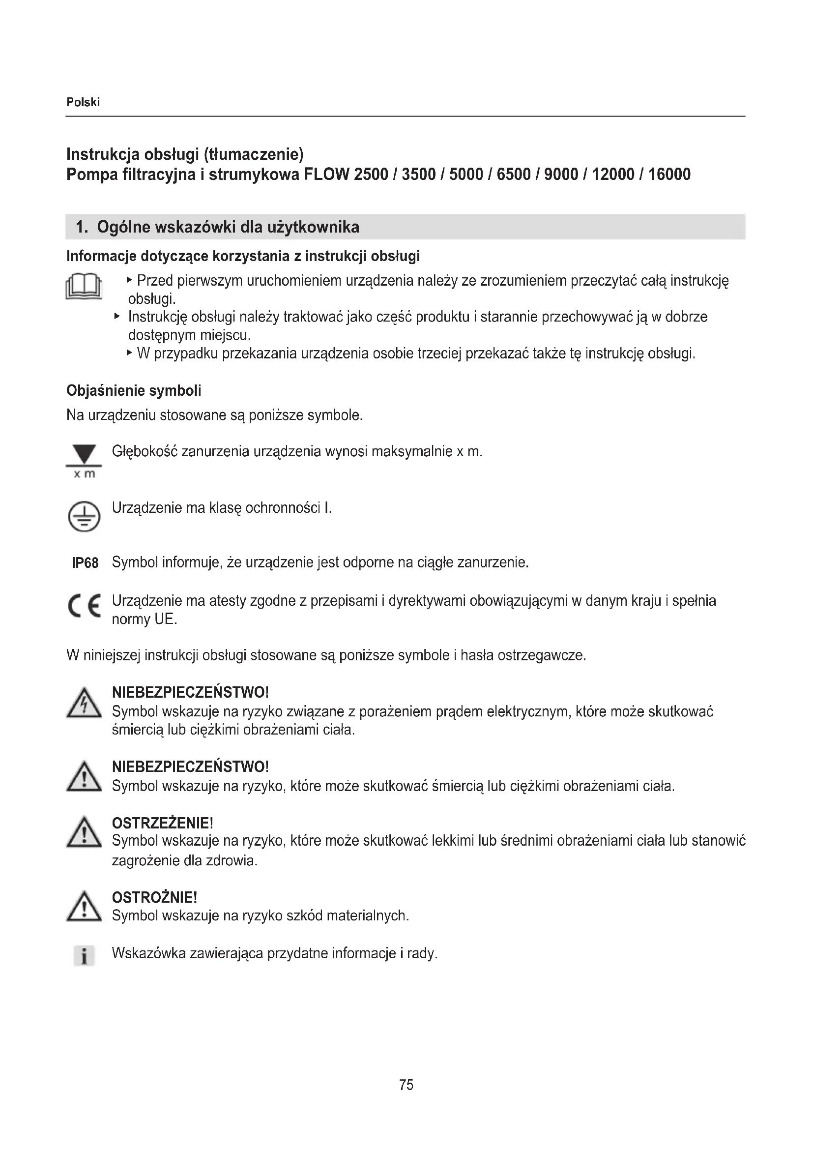 Informacje dotyczące korzystania z instrukcji obsługi ▶ Przed pierwszym uruchomieniem urządzenia należy ze zrozumieniem przeczytać całą instrukcję obsługi. ▶ Instrukcję obsługi należy traktować jako część produktu i starannie przechowywać ją w dobrze dostępnym miejscu. ▶ W przypadku przekazania urządzenia osobie trzeciej przekazać także tę instrukcję obsługi. Objaśnienie symboli Na urządzeniu stosowane są poniższe symbole. Głębokość zanurzenia urządzenia wynosi maksymalnie x m. Urządzenie ma klasę ochronności I. Symbol informuje, że urządzenie jest odporne na ciągłe zanurzenie. Urządzenie ma atesty zgodne z przepisami i dyrektywami obowiązującymi w danym kraju i spełnia normy UE. W niniejszej instrukcji obsługi stosowane są poniższe symbole i hasła ostrzegawcze. NIEBEZPIECZEŃSTWO! Symbol wskazuje na ryzyko związane z porażeniem prądem elektrycznym, które może skutkować śmiercią lub ciężkimi obrażeniami ciała. NIEBEZPIECZEŃSTWO! Symbol wskazuje na ryzyko, które może skutkować śmiercią lub ciężkimi obrażeniami ciała. OSTRZEŻENIE! Symbol wskazuje na ryzyko, które może skutkować lekkimi lub średnimi obrażeniami ciała lub stanowić zagrożenie dla zdrowia. OSTROŻNIE! Symbol wskazuje na ryzyko szkód materialnych. Wskazówka zawierająca przydatne informacje i rady. IP6876 Polski Rodzaje oznaczeń Odnośnik do rysunku, tutaj odnośnik do rysunku A. Wezwanie do podjęcia działania.