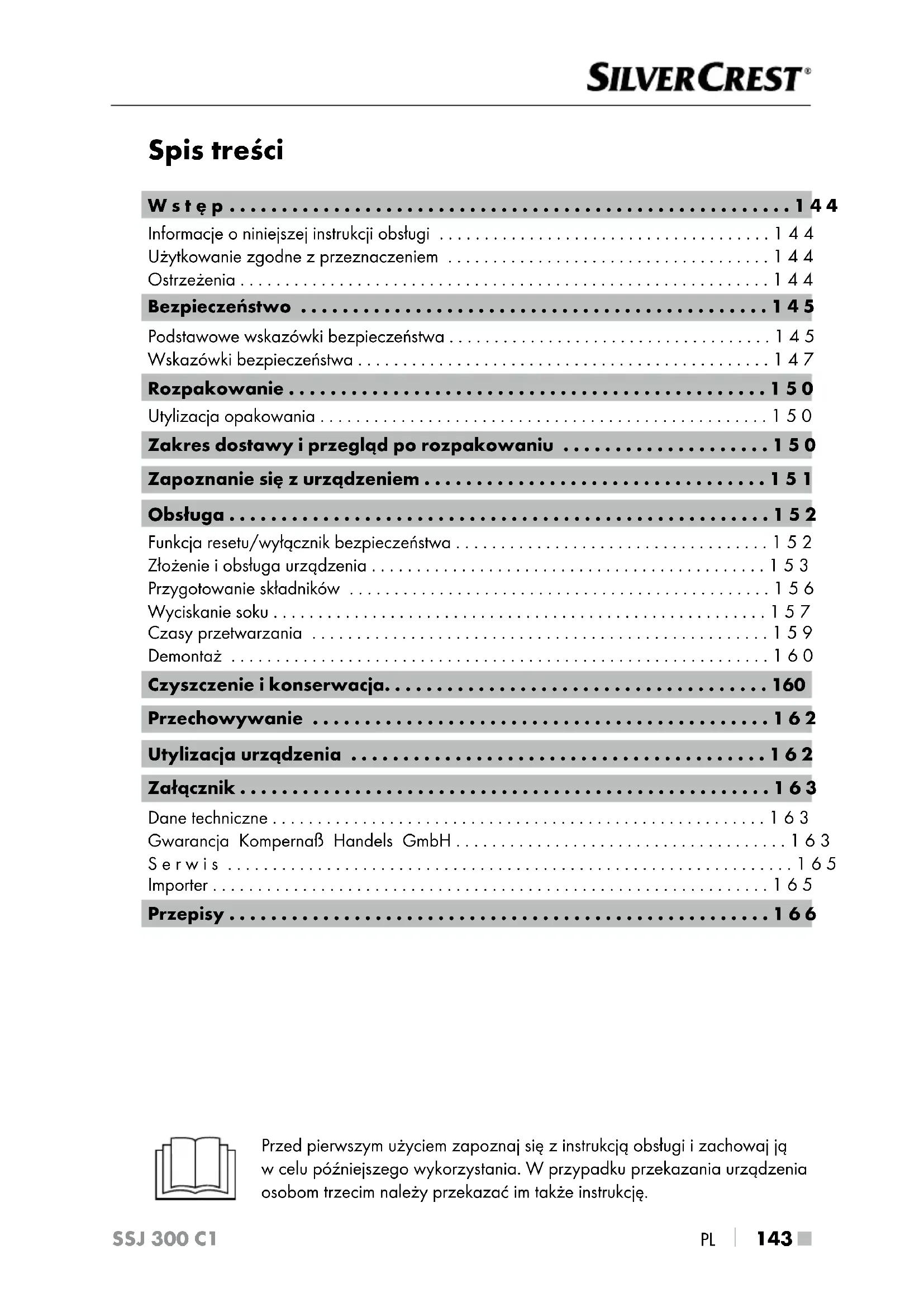 PL SSJ 300 C1 Wstęp Informacje o niniejszej instrukcji obsługi Serdecznie gratulujemy zakupu nowego urządzenia. Wybrany produkt charakteryzuje się wysoką jakością. Instrukcja obsługi jest czę- ścią składową produktu. Zawiera ona ważne informacje na temat bezpieczeń- stwa, użytkowania i utylizacji. Przed rozpoczęciem użytkowania produktu należy zapoznać się ze wszystkimi informacjami dotyczącymi obsługi i bezpieczeństwa. Produkt należy użytkować wyłącznie zgodnie z zamieszczonym tu opisem oraz w podanym zakresie zastosowań. W przypadku przekazania urządzenia osobie trzeciej należy dołączyć również całą dokumentację. Użytkowanie zgodne z przeznaczeniem Urządzenie jest przeznaczone do wyciskania soku z dojrzałych i obranych owoców i warzyw. Urządzenie nadaje się wyłącznie do przetwarzania produktów spożywczych. Należy używać wyłącznie oryginalnych akcesoriów, takich jak opi- sane w instrukcji. Każde inne lub wykraczające poza ten zakres użycie uważane jest za niezgodne z przeznaczeniem i niesie za sobą poważne niebezpieczeństwo wypadku. Urządzenie nie jest przeznaczone do zastosowań komercyjnych ani przemysłowych. Urządzenie to przeznaczone jest wyłącznie do zastosowań w prywatnych gospodarstwach domowych. Roszczenia wszelkiego rodzaju w związku ze szkodami powstałymi wskutek użytkowania niezgodnego z przeznaczeniem, przeprowadzenia niefachowych napraw, zmianami wprowadzonymi bez zezwolenia lub wskutek zastosowania niedopuszczonych części zamiennych są wykluczone. Wszelkie ryzyko ponosi wyłącznie użytkownik. Ostrzeżenia Wtej instrukcji obsługi użyto następujących wskazówek ostrzegawczych (oile mają zastosowanie): NIEBEZPIECZEŃSTWO Ostrzeżenie o takim stopniu zagrożenia informuje o grożącej niebezpiecznej sytuacji. Nieuniknięcie niebezpiecznej sytuacji może doprowadzić do śmierci lub powstania ciężkich obrażeń. ► Należy przestrzegać zaleceń zawartych w tym ostrzeżeniu, aby uniknąć niebezpieczeństwa śmierci lub ciężkich obrażeń ciała.PL