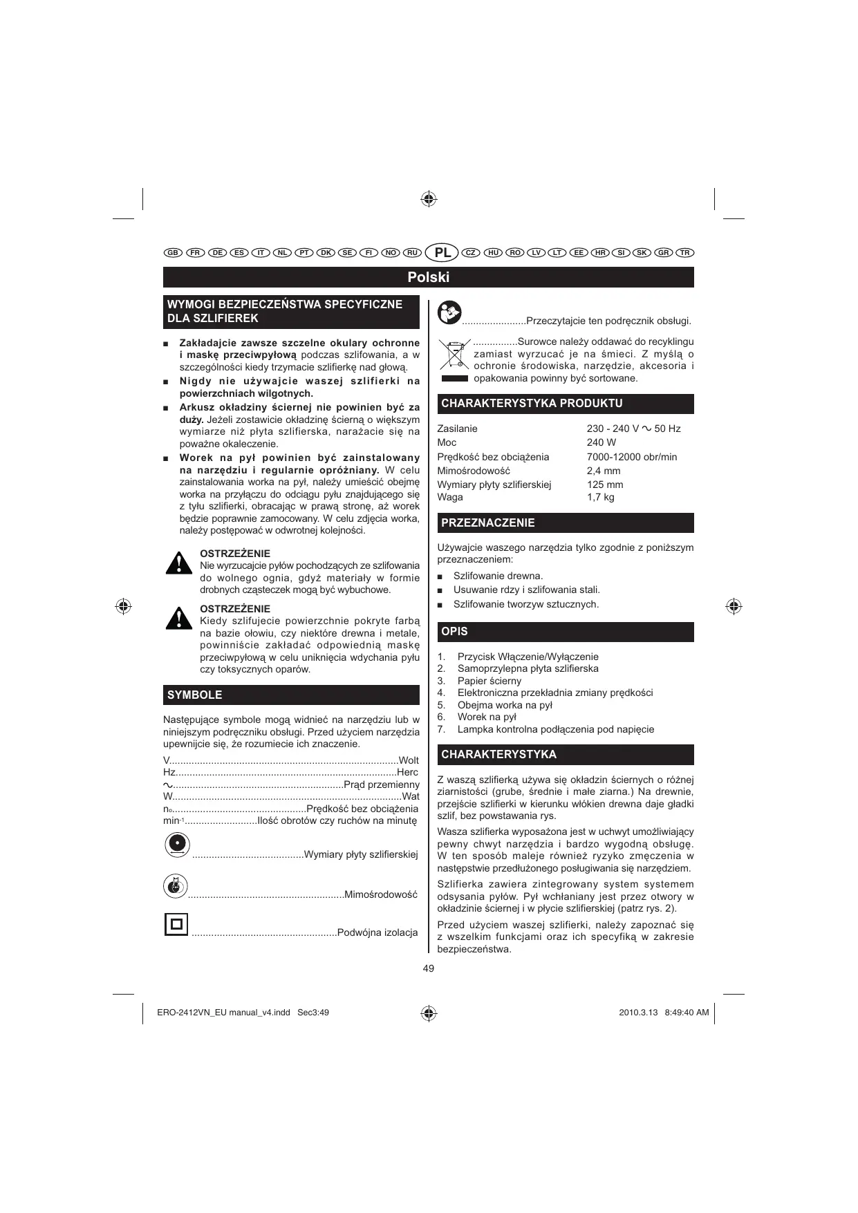50 Hz 240 W 7000-12000 obr/min 2,4 mm 125 mm 1,7 kg PRZEZNACZENIE Uywajcie waszego narzdzia tylko zgodnie z poniszym przeznaczeniem: OSTRZEENIE Nie wyrzucajcie pyów pochodzcych ze szlifowania do wolnego ognia, gdy materiay w formie drobnych czsteczek mog by wybuchowe.