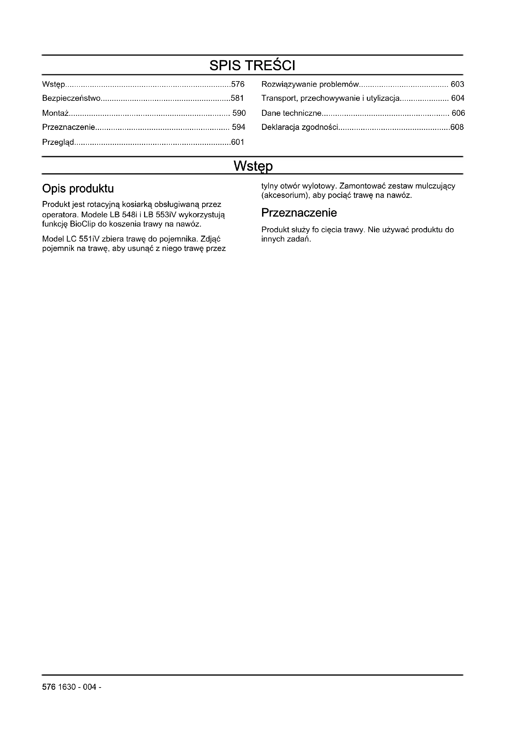- Deklaracja zgodności Wstęp Opis produktu Produkt jest rotacyjną kosiarką obsługiwaną przez operatora. Modele LB 548i i LB553iV wykorzystują funkcję BioClip do koszenia trawy na nawóz. Model LC551iV zbiera trawę do pojemnika. Zdjąć pojemnik na trawę, aby usunąć z niego trawę przez tylny otwór wylotowy. Zamontować zestaw mulczujący (akcesorium), aby pociąć trawę na nawóz. Przeznaczenie Produkt służy fo cięcia trawy. Nie używać produktu do innych zadań. 576 1630 - 004 -Przegląd produktu (LB548i, LC551iV) LB 548i LC 551iV p. 608