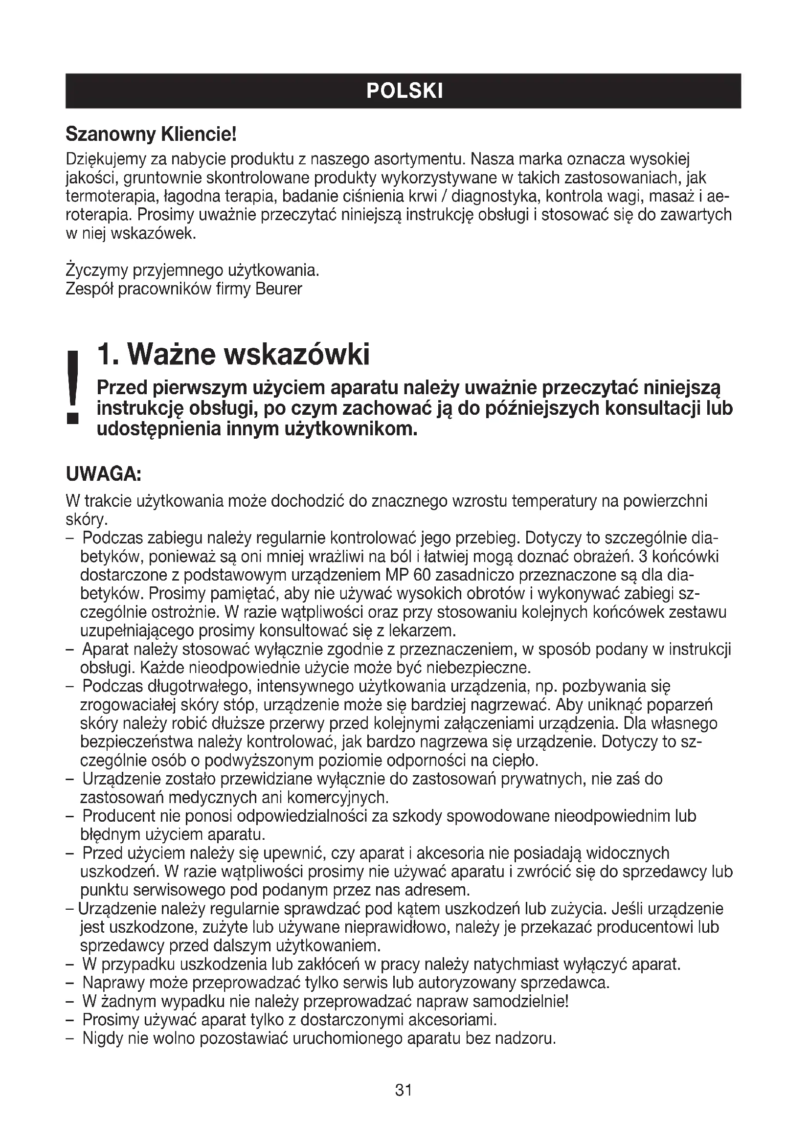 Przed pierwszym użyciem aparatu należy uważnie przeczytać niniejszą instrukcję obsługi, po czym zachować ją do późniejszych konsultacji lub udostępnienia innym użytkownikom. UWAGA: W trakcie użytkowania może dochodzić do znacznego wzrostu temperatury na powierzchni skóry. – Podczas zabiegu należy regularnie kontrolować jego przebieg. Dotyczy to szczególnie dia- betyków, ponieważ są oni mniej wrażliwi na ból i łatwiej mogą doznać obrażeń. 3 końcówki dostarczone z podstawowym urządzeniem MP 60 zasadniczo przeznaczone są dla dia- betyków. Prosimy pamiętać, aby nie używać wysokich obrotów i wykonywać zabiegi sz- czególnie ostrożnie. W razie wątpliwości oraz przy stosowaniu kolejnych końcówek zestawu uzupełniającego prosimy konsultować się z lekarzem. – Aparat należy stosować wyłącznie zgodnie z przeznaczeniem, w sposób podany w instrukcji obsługi. Każde nieodpowiednie użycie może być niebezpieczne. – Podczas długotrwałego, intensywnego użytkowania urządzenia, np. pozbywania się zrogowaciałej skóry stóp, urządzenie może się bardziej nagrzewać. Aby uniknąć poparzeń skóry należy robić dłuższe przerwy przed kolejnymi załączeniami urządzenia. Dla własnego bezpieczeństwa należy kontrolować, jak bardzo nagrzewa się urządzenie. Dotyczy to sz- czególnie osób o podwyższonym poziomie odporności na ciepło. – Urządzenie zostało przewidziane wyłącznie do zastosowań prywatnych, nie zaś do zastosowań medycznych ani komercyjnych. – Producent nie ponosi odpowiedzialności za szkody spowodowane nieodpowiednim lub błędnym użyciem aparatu. – Przed użyciem należy się upewnić, czy aparat i akcesoria nie posiadają widocznych uszkodzeń. W razie wątpliwości prosimy nie używać aparatu i zwrócić się do sprzedawcy lub punktu serwisowego pod podanym przez nas adresem. – Urządzenie należy regularnie sprawdzać pod kątem uszkodzeń lub zużycia. Jeśli urządzenie jest uszkodzone, zużyte lub używane nieprawidłowo, należy je przekazać producentowi lub sprzedawcy przed dalszym użytkowaniem. – W przypadku uszkodzenia lub zakłóceń w pracy należy natychmiast wyłączyć aparat. – Naprawy może przeprowadzać tylko serwis lub autoryzowany sprzedawca. – W żadnym wypadku nie należy przeprowadzać napraw samodzielnie! – Prosimy używać aparat tylko z dostarczonymi akcesoriami. – Nigdy nie wolno pozostawiać uruchomionego aparatu bez nadzoru. POLSKI !32 – Aby uniknąć ewentualnych niebezpieczeństw nie należy dopuszczać do kontaktu dzieci z aparatem. – Aparat należy trzymać z dala od źródeł ciepła. – Nie używać aparatu pod kołdrami, poduszkami, etc. – Aparat może pracować nieprzerwanie nie dłużej niż 15 minut. Po tym czasie należy wyłączyć go na przynajmniej 30 minut, aby zapobiec przegrzaniu silnika. – Nie należy używać aparatu w trakcie kąpieli w wannie lub pod prysznicem. Nie wolno przechowywać aparatu w miejscach, z których może on spaść do wanny lub umywalki. – Nigdy nie należy zanurzać aparatu w wodzie ani w innych cieczach. – Jeżeli aparat wpadnie do wody, należy natychmiast wyłączyć zasilacz z sieci. – Przed każdym użyciem aparatu i zasilacza ręce muszą być suche. – Wyciągając zasilacz z kontaktu nie wolno ciągnąć za kabel ani aparat. – Zasilacz można podłączyć tylko do sieci o napięciu podanym na jego obudowie. – Jeśłi zasilacz ulegnie uszkodzeniu, nie wolno dłużej używać tej przejściówki! – Niniejsze urządzenie nie jest przeznaczone do obsługi przez osoby (w tym dzieci) upośledzone fizycznie, sensorycznie lub psychicznie, lub też osoby bez doświadczenia lub/i wiedzy, chy- ba że są nadzorowane przez właściwego opiekuna lub otrzymały przeszkolenie, jak używać urządzenia. – Dzieci należy pilnować, aby nie bawiły się urządzeniem. – Ze względów higienicznych urządzenia może używać tylko jedna osoba.