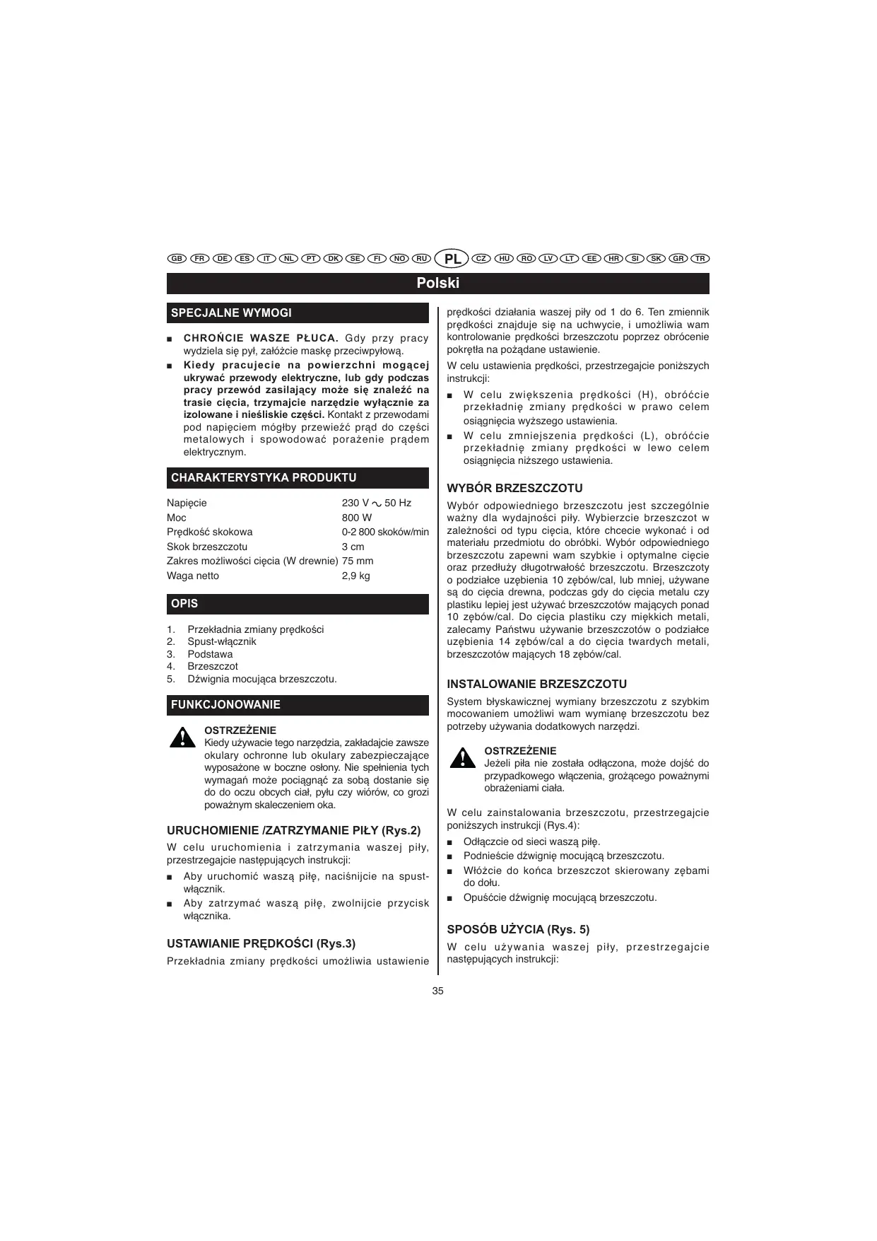 Napicie Moc Prdko skokowa Skok brzeszczotu Zakres moliwoci cicia (W drewnie) Waga netto 230 V 50 Hz 800 W 0-2 800 skoków/min 3 cm 75 mm 2,9 kg Wybór odpowiedniego brzeszczotu jest szczególnie wany dla wydajnoci piy. Wybierzcie brzeszczot w zalenoci od typu cicia, które chcecie wykona i od materiau przedmiotu do obróbki. Wybór odpowiedniego brzeszczotu zapewni wam szybkie i optymalne cicie oraz przeduy dugotrwao brzeszczotu. Brzeszczoty o podziace uzbienia 10 zbów/cal, lub mniej, uywane s do cicia drewna, podczas gdy do cicia metalu czy plastiku lepiej jest uywa brzeszczotów majcych ponad 10 zbów/cal. Do cicia plastiku czy mikkich metali, zalecamy Pastwu uywanie brzeszczotów o podziace uzbienia 14 zbów/cal a do cicia twardych metali, brzeszczotów majcych 18 zbów/cal. OPIS