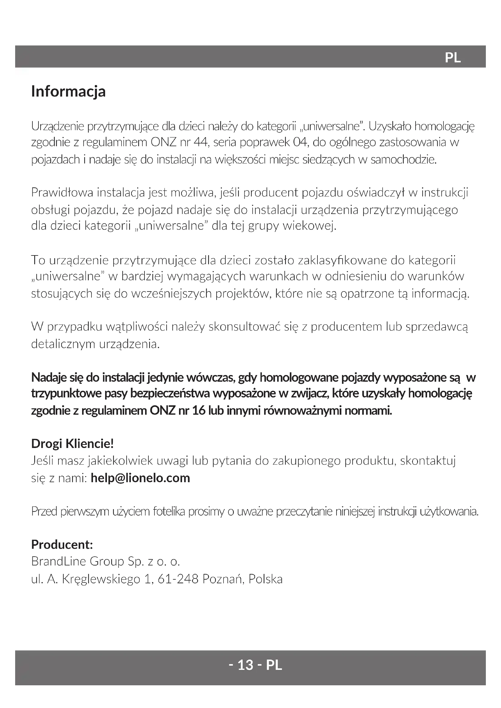 Informacja Urządzenie przytrzymujące dla dzieci należy do kategorii „uniwersalne”. Uzyskało homologację zgodnie z regulaminem ONZ nr 44, seria poprawek 04, do ogólnego zastosowania w pojazdach i nadaje się do instalacji na większości miejsc siedzących w samochodzie. Prawidłowa instalacja jest możliwa, jeśli producent pojazdu oświadczył w instrukcji obsługi pojazdu, że pojazd nadaje się do instalacji urządzenia przytrzymującego dla dzieci kategorii „uniwersalne” dla tej grupy wiekowej. To urządzenie przytrzymujące dla dzieci zostało zaklasykowane do kategorii „uniwersalne” w bardziej wymagających warunkach w odniesieniu do warunków stosujących się do wcześniejszych projektów, które nie są opatrzone tą informacją. W przypadku wątpliwości należy skonsultować się z producentem lub sprzedawcą detalicznym urządzenia. Nadaje się do instalacji jedynie wówczas, gdy homologowane pojazdy wyposażone są w trzypunktowe pasy bezpieczeństwa wyposażone w zwijacz, które uzyskały homologację zgodnie z regulaminem ONZ nr 16 lub innymi równoważnymi normami. Drogi Kliencie! Jeśli masz jakiekolwiek uwagi lub pytania do zakupionego produktu, skontaktuj się z nami: help@lionelo.com Przed pierwszym użyciem fotelika prosimy o uważne przeczytanie niniejszej instrukcji użytkowania. Producent: BrandLine Group Sp. z o. o. ul. A. Kręglewskiego 1, 61-248 Poznań, Polska‑ 14 ‑PL Ważne informacje Należy przeczytać tę instrukcję obsługi przed użyciem i zachować. Instrukcja pomoże prawidłowo zamontować fotelik. Nieprawidłowy montaż może stanowić zagrożenie dla zdrowia dziecka. Producent nie ponosi odpowiedzialności za ewentualne zagrożenia spowodowane niewłaściwym montażem fotelika. Niniejszy fotelik przeznaczony jest dla grup wagowych I, II i III, co oznacza, że mogą z niego korzystać dzieci o wadze od 9 do 36 kg. I grupa wagowa: 9-18 kg, II grupa wagowa: 15-25 kg, III grupa wagowa: 22-36 kg.