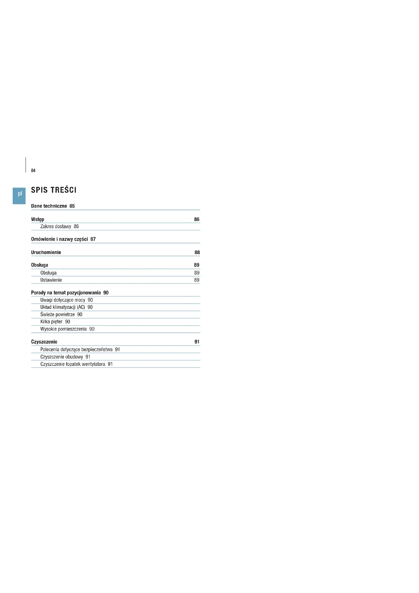 Dane techniczne 85 Wstęp 86 Zakres dostawy 86 Omówienie i nazwy części 87 Uruchomienie 88 Obsługa 89 Obsługa 89 Ustawienie 89 Porady na temat pozycjonowania 90 Uwagi dotyczące mocy 90 Układ klimatyzacji (AC) 90 Świeże powietrze 90 Kilka pięter 90 Wysokie pomieszczenia 90 Czyszczenie 91 Polecenia dotyczące bezpieczeństwa 91 Czyszczenie obudowy 91 Czyszczenie łopatek wentylatora 9185