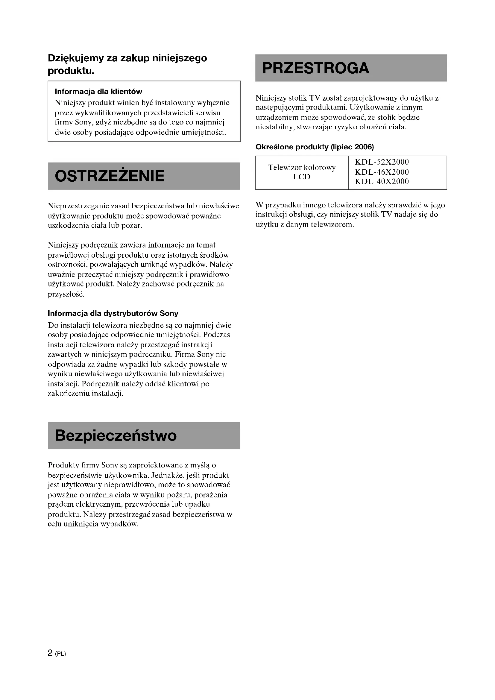 Примечание по грузоподъемности2 (PL) Dziękujemy za zakup niniejszego produktu. Nieprzestrzeganie zasad bezpieczeństwa lub niewłaściwe użytkowanie produktu może spowodować poważne uszkodzenia ciała lub pożar. Niniejszy podręcznik zawiera informacje na temat prawidłowej obsługi produktu oraz istotnych środków ostrożności, pozwalających uniknąć wypadków. Należy uważnie przeczytać niniejszy podręcznik i prawidłowo użytkować produkt. Należy zachować podręcznik na przyszłość. Informacja dla dystrybutorów Sony Do instalacji telewizora niezbędne są co najmniej dwie osoby posiadające odpowiednie umiejętności. Podczas instalacji telewizora należy przestzegać instrakcji zawartych w niniejszym podreczniku. Firma Sony nie odpowiada za żadne wypadki lub szkody powstałe w wyniku niewłaściwego użytkowania lub niewłaściwej instalacji. Podręcznik należy oddać klientowi po zakończeniu instalacji. Produkty firmy Sony są zaprojektowane z myślą o bezpieczeństwie użytkownika. Jednakże, jeśli produkt jest użytkowany nieprawidłowo, może to spowodować poważne obrażenia ciała w wyniku pożaru, porażenia prądem elektrycznym, przewrócenia lub upadku produktu. Należy przestrzegać zasad bezpieczeństwa w celu uniknięcia wypadków. Niniejszy stolik TV został zaprojektowany do użytku z następującymi produktami. Użytkowanie z innym urządzeniem może spowodować, że stolik będzie niestabilny, stwarzając ryzyko obrażeń ciała. Określone produkty (lipiec 2006) W przypadku innego telewizora należy sprawdzić w jego instrukcji obsługi, czy niniejszy stolik TV nadaje się do użytku z danym telewizorem. Informacja dla klientów Niniejszy produkt winien być instalowany wyłącznie przez wykwalifikowanych przedstawicieli serwisu firmy Sony, gdyż niezbędne są do tego co najmniej dwie osoby posiadające odpowiednie umiejętności. OSTRZEŻENIE Bezpieczeństwo PRZESTROGA Telewizor kolorowy LCD KDL-52X2000 KDL-46X2000 KDL-40X20003 (PL) Niniejszy produkt winien być instalowany wyłącznie przez wykwalifikowanych przedstawicieli serwisu firmy Sony. Instalacja dokonana przez osoby niewykwalifikowane grozi poważnymi uszkodzeniami ciała, gdyż telewizor i stolik TV są bardzo ciężkie. Stolik TV należy zabezpieczyć przed przewróceniem. W przeciwnym razie telewizor może upaść i spowodować obrażenia ciała. Telewizor należy zamocować do ściany, słupa itp., w celu zabezpieczenia przed przewróceniem. Stolik TV należy umieścić na płaskiej, stabilnej podłodze. Stolik TV należy ustawić prosto w pozycji poziomej. Pochyłe ustawienie stolika TV grozi jego przewróceniem lub upadkiem telewizora. Może to spowodować obrażenia ciała. Umieszczając stolik TV na miękkiej powierzchni, jak np. mata czy dywan, należy podłożyć pod niego twardą płytę. Nie należy używać uszkodzonego stolika TV. Nie należy opierać się ani zwieszać się z telewizora zainstalowanego na stoliku TV. Grozi to przewróceniem stolika TV lub upadkiem telewizora i w konsekwencji poważnymi uszkodzeniami ciała lub śmiercią. Nie należy pozwalać dzieciom wspinać się na stolik TV ani pełzać między półkami. Jeśli dziecko wejdzie na stolik TV lub między półki, może dojść do poważnych obrażeń ciała lub śmierci, spowodowanych pęknięciem szkła, przewróceniem stolika TV lub upadkiem telewizora. Nie należy wchodzić na stolik TV. Można spaść lub stłuc szybę i doznać obrażeń ciała. Nie należy zakrywać otworu wentylacyjnego telewizora. W przypadku zakrycia otworu wentylacyjnego (np. obrusem) zbyt duża temperatura wewnątrz urządzenia może spowodować pożar. Należy uważać, by nie przytrzasnąć przewodu zasilającego lub przewodu łączącego.