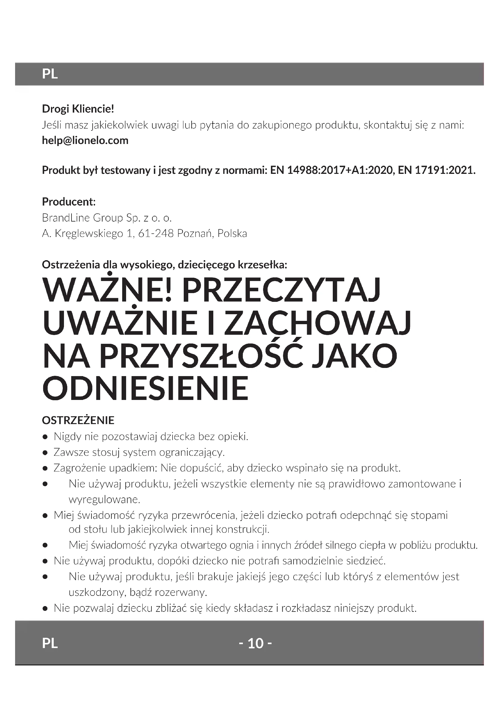 Drogi Kliencie! Jeśli masz jakiekolwiek uwagi lub pytania do zakupionego produktu, skontaktuj się z nami: help@lionelo.com Produkt był testowany i jest zgodny z normami: EN 14988:2017+A1:2020, EN 17191:2021. Producent: BrandLine Group Sp. z o. o. A. Kręglewskiego 1, 61-248 Poznań, Polska Ostrzeżenia dla wysokiego, dziecięcego krzesełka: