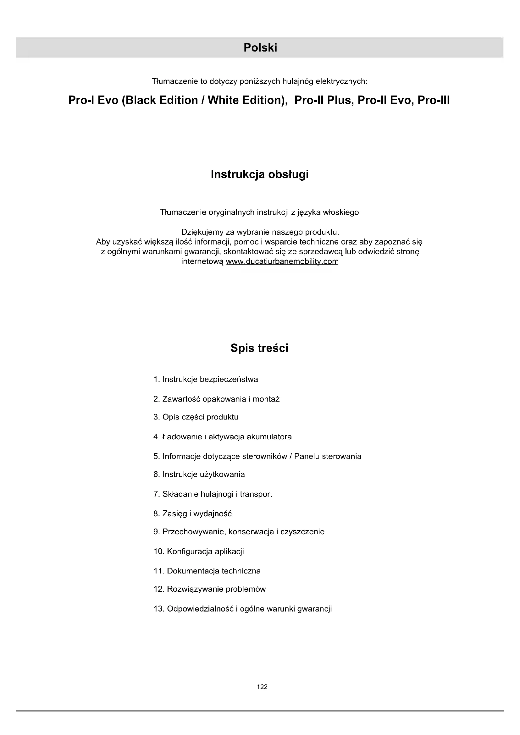 Instrukcja obsługi Tłumaczenie oryginalnych instrukcji z języka włoskiego Dziękujemy za wybranie naszego produktu. Aby uzyskać większą ilość informacji, pomoc i wsparcie techniczne oraz aby zapoznać się z ogólnymi warunkami gwarancji, skontaktować się ze sprzedawcą lub odwiedzić stronę internetową www.ducatiurbanemobility.com Polski Tłumaczenie to dotyczy poniższych hulajnóg elektrycznych: Pro-I Evo (Black Edition / White Edition), Pro-II Plus, Pro-II Evo, Pro-III