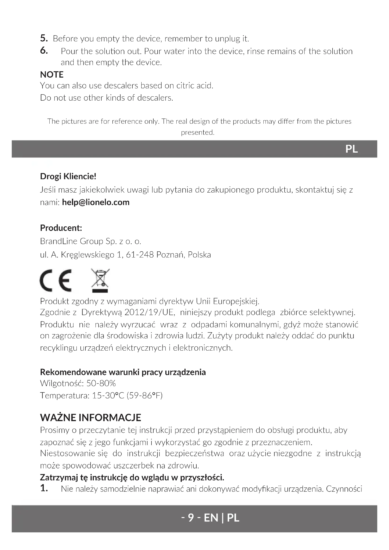 Drogi Kliencie! Jeśli masz jakiekolwiek uwagi lub pytania do zakupionego produktu, skontaktuj się z nami: help@lionelo.com Producent: BrandLine Group Sp. z o. o. ul. A. Kręglewskiego 1, 61-248 Poznań, Polska Produkt zgodny z wymaganiami dyrektyw Unii Europejskiej. Zgodnie z Dyrektywą 2012/19/UE, niniejszy produkt podlega zbiórce selektywnej. Produktu nie należy wyrzucać wraz z odpadami komunalnymi, gdyż może stanowić on zagrożenie dla środowiska i zdrowia ludzi. Zużyty produkt należy oddać do punktu recyklingu urządzeń elektrycznych i elektronicznych. Rekomendowane warunki pracy urządzenia Wilgotność: 50-80% Temperatura: 15-30°C (59-86°F)