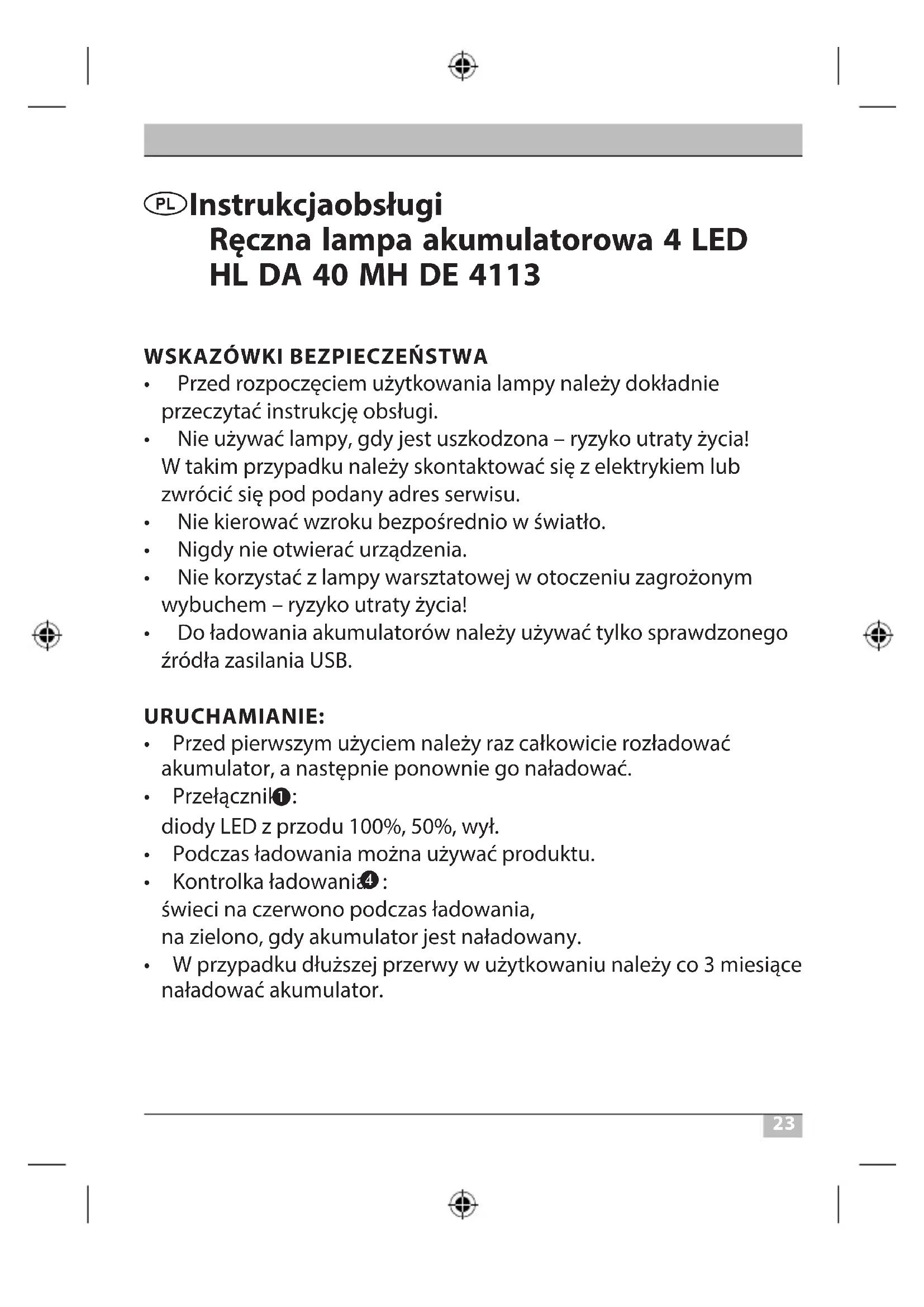 Instrukcja obsługi Ręczna lampa akumulatorowa 4 LED HL DA 40 MH DE 4113