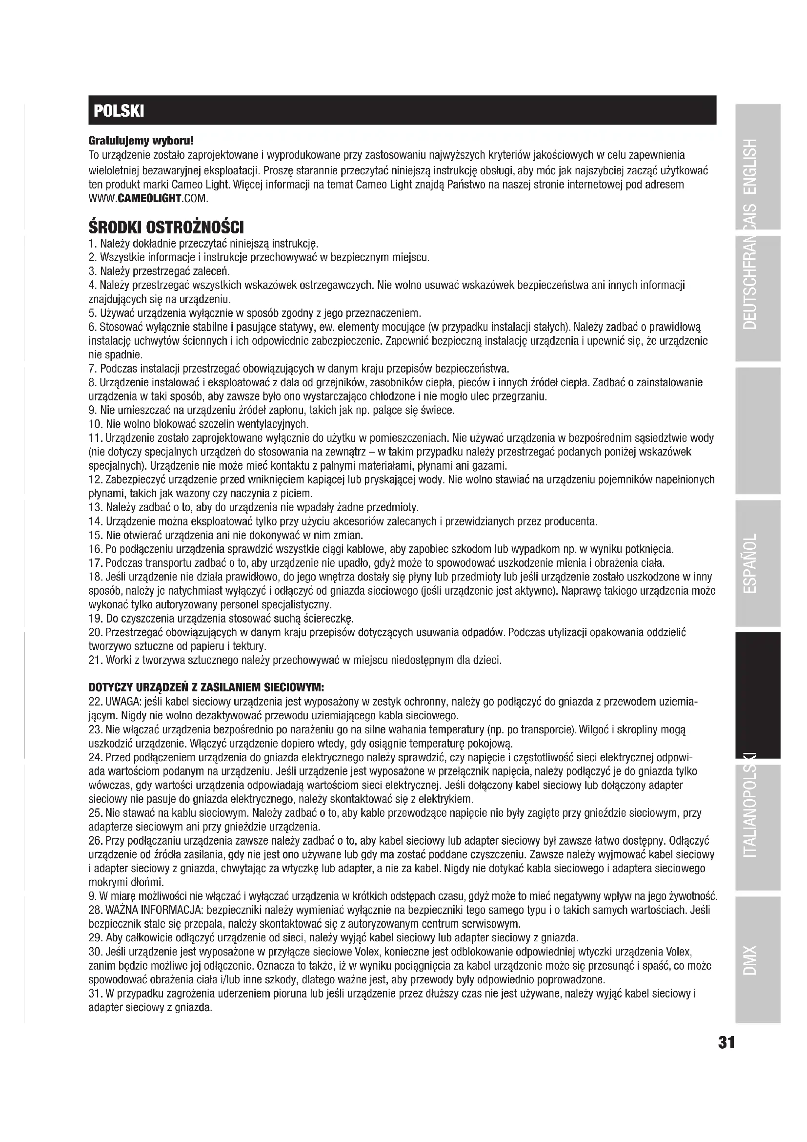 (Obowiązuje w Unii Europejskiej i innych krajach europejskich stosujących system sortowania odpadów) Niniejszy symbol na produk- cie lub związanych z nim dokumentach wskazuje, iż urządzenie po zakończeniu okresu użytkowania nie może być utylizowane razem ze standardowymi odpadami domowymi, aby uniknąć szkód w środowisku lub szkód na osobie powstałych w wyniku niekontrolowanego usuwania odpadów. Niniejszy produkt należy utylizować oddzielnie od innych odpadów i przekazać do punktu recyklingu w celu ponownego wykorzystania użytych w nim materiałów w ramach idei zrównoważonego rozwoju. Klienci prywatni otrzymują informacje w zakresie przyja- znych dla środowiska możliwości usuwania odpadów od sprzedawcy, u którego produkt został zakupiony, lub w odpowiednich placówkach regionalnych. Użytkownicy będący przedsiębiorcami proszeni są o kontakt ze swoimi dostawcami i ewentualne sprawdzenie uzgodnionych umownie warunków utylizacji urządzeń. Niniejszy produkt nie może być utylizowany razem z innymi odpadami przemysłowymi. Deklaracja zgodności CE Firma Adam Hall GmbH niniejszym oświadcza, że produkt ten jest zgodny z następującymi dyrektywami (o ile mają zastosowanie): dyrektywa w sprawie urządzeń radiowych i końcowych urządzeń telekomunikacyjnych (1999/5/WE) lub dyrektywa w sprawie urządzeń radiowych (2014/53/UE) od czerwca 2017 r. dyrektywa niskonapięciowa (2014/35/UE) dyrektywa w sprawie kompatybilności elektromagnetycznej (2014/30/UE) dyrektywa w sprawie ograniczenia stosowania niektórych niebezpiecznych substancji w sprzęcie elektrycznym i elektronicznym (2011/65/UE) Pełna wersja deklaracji zgodności znajduje się na stronie internetowej www.adamhall.com. Ponadto zapytania w tej sprawie można przesyłać na adres e-mail info@adamhall.com.38 DMX ITALIANO POLSKI ESPAÑOL FRANCAIS DEUTSCHENGLISH ITALIANO Avete fatto la scelta giusta! Questo dispositivo è stato sviluppato e prodotto in conformità con elevati standard qualitativi che ne garantiscono il regolare funzionamento per molti anni. Leggete attentamente questo manuale d‘uso per utilizzare al meglio il vostro nuovo prodotto Cameo Light. Per maggiori informazioni su Cameo Light consultare la nostra pagina Web WWW.CAMEOLIGHT.COM. MISURE PRECAUZIONALI