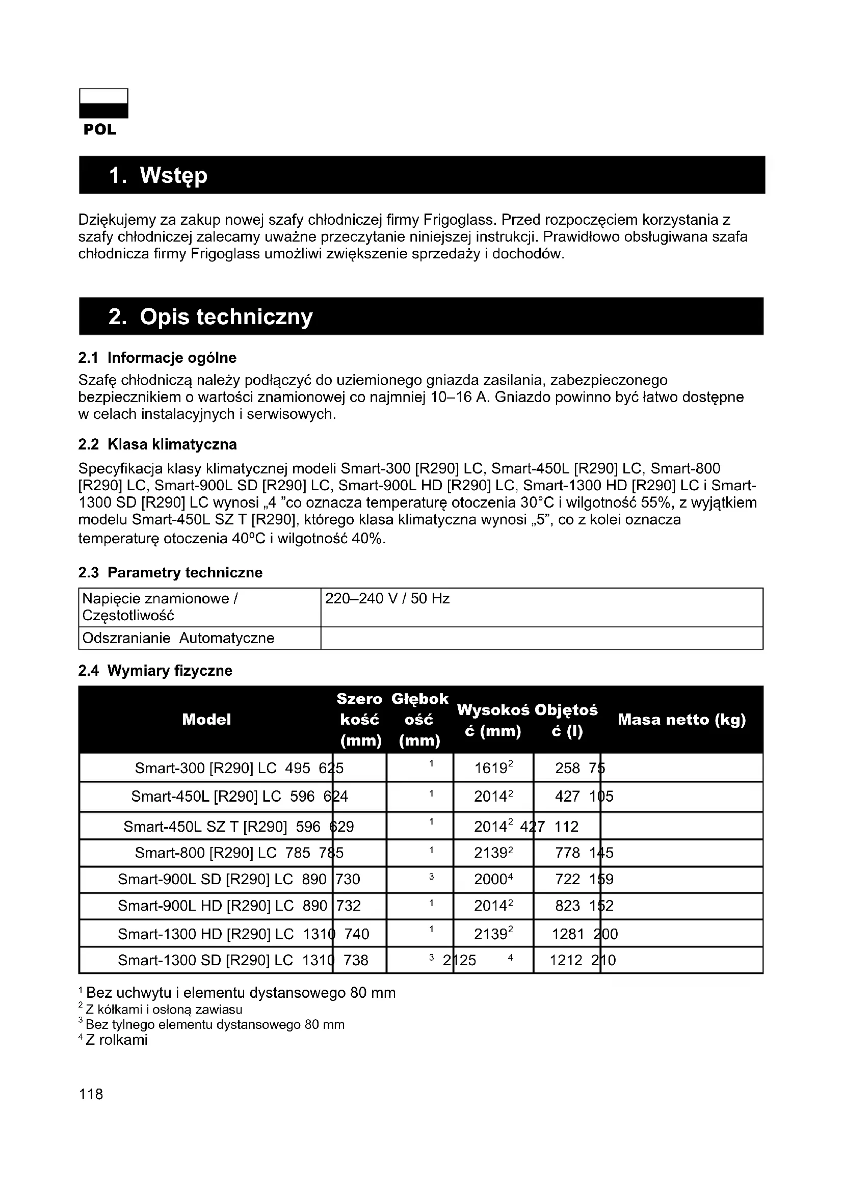 Modele Smart-300 [R290] LC, Smart-450L [R290] LC, Smart-450L SZ T [R290], Smart-800 [R290] LC, Smart-900L SD [R290] LC, Smart-900L HD [R290] LC, Smart-1300 HD [R290] LC i Smart- 1300 SD [R290] LC wykorzystują węglowodorowy czynnik chłodniczy. Zostały przetestowana na potwierdzenie zgodności z wymaganiami odpowiednich norm. W niniejszej instrukcji obsługi opisano procedury bezpiecznej eksploatacji i konserwacji urządzenia. Należy ich starannie przestrzegać. Instalacja urządzenia musi zostać przeprowadzona przez odpowiednio przeszkoloną osobę.