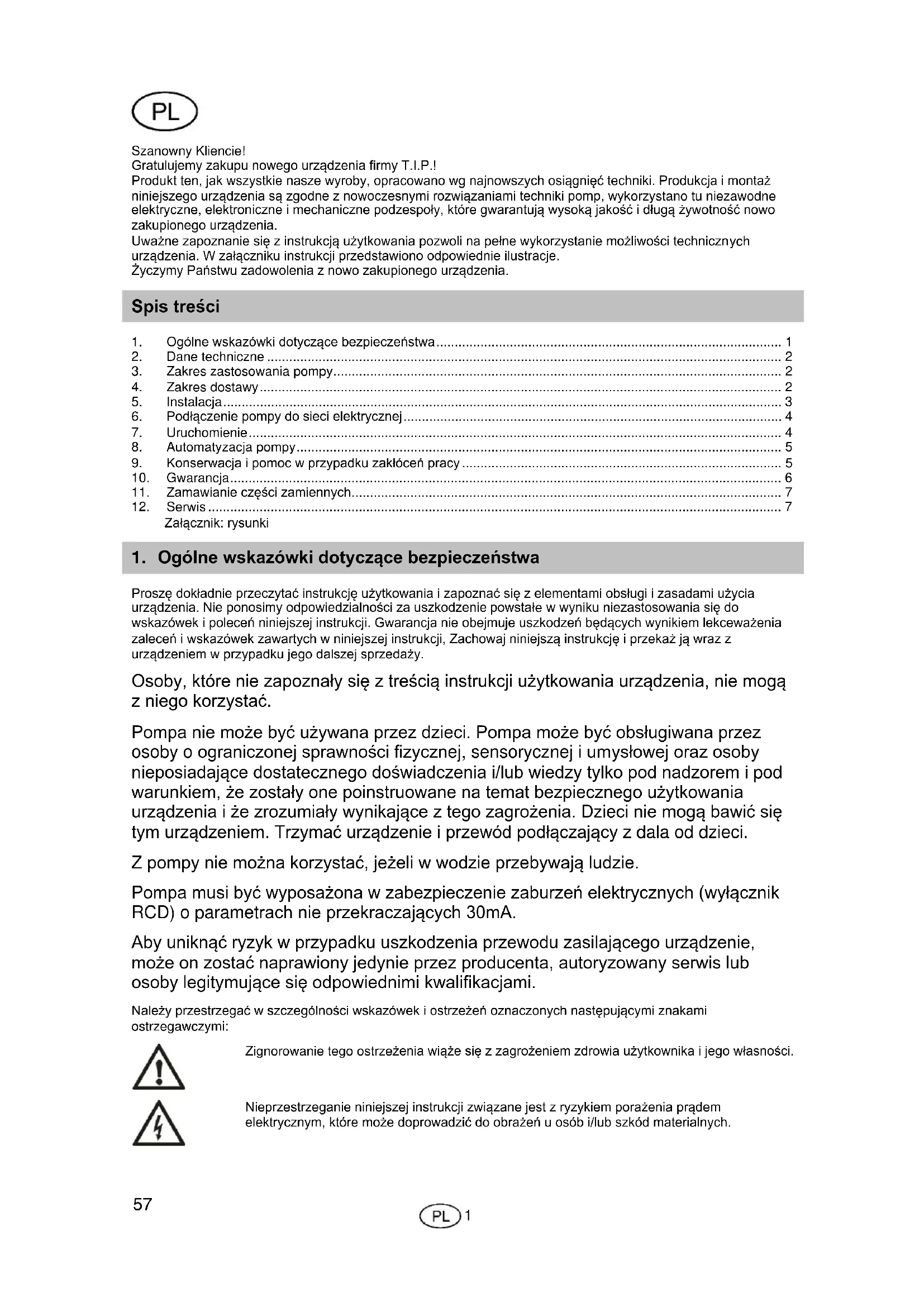 - Szanowny Kliencie! Gratulujemy zakupu nowego urządzenia firmy T.I.P.! Produkt ten, jak wszystkie nasze wyroby, opracowano wg najnowszych osiągnięć techniki. Produkcja i montaż niniejszego urządzenia są zgodne z nowoczesnymi rozwiązaniami techniki pomp, wykorzystano tu niezawodne elektryczne, elektroniczne i mechaniczne podzespoły, które gwarantują wysoką jakość i długą żywotność nowo zakupionego urządzenia. Uważne zapoznanie się z instrukcją użytkowania pozwoli na pełne wykorzystanie możliwości technicznych urządzenia. W załączniku instrukcji przedstawiono odpowiednie ilustracje. Życzymy Państwu zadowolenia z nowo zakupionego urządzenia. Spis treści 1. Ogólne wskazówki dotyczące bezpieczeństwa p. 1