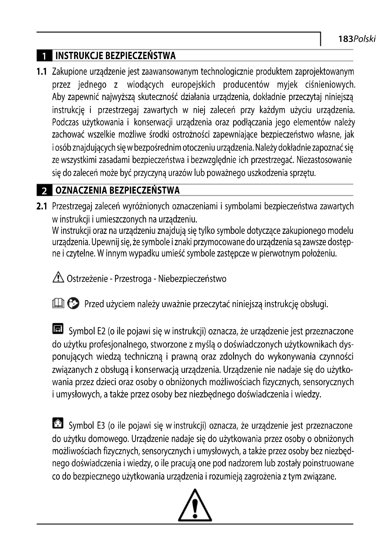 Zakupione urządzenie jest zaawansowanym technologicznie produktem zaprojektowanym przez jednego z wiodących europejskich producentów myjek ciśnieniowych. Aby zapewnić najwyższą skuteczność działania urządzenia, dokładnie przeczytaj niniejszą instrukcję i przestrzegaj zawartych w niej zaleceń przy każdym użyciu urządzenia. Podczas użytkowania i konserwacji urządzenia oraz podłączania jego elementów należy zachować wszelkie możliwe środki ostrożności zapewniające bezpieczeństwo własne, jak i osób znajdujących się w bezpośrednim otoczeniu urządzenia. Należy dokładnie zapoznać się zewszystkimi zasadami bezpieczeństwa ibezwzględnie ich przestrzegać. Niezastosowanie się dozaleceń może być przyczyną urazów lub poważnego uszkodzenia sprzętu.