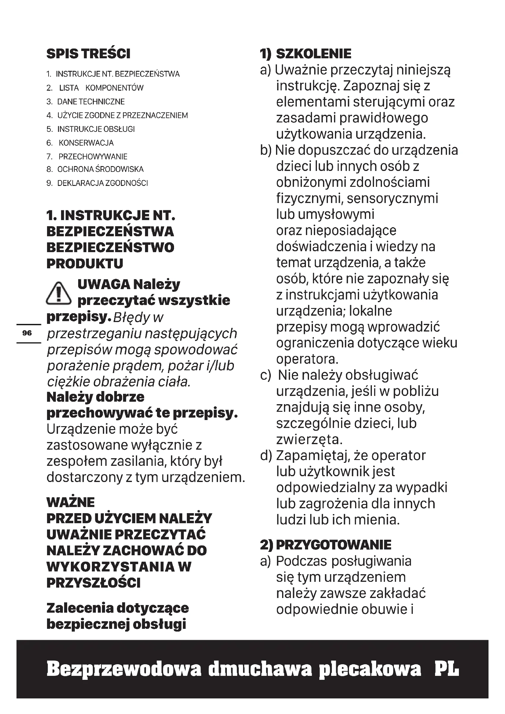a) Uważnie przeczytaj niniejszą instrukcję. Zapoznaj się z elementami sterującymi oraz zasadami prawidłowego użytkowania urządzenia. b) Nie dopuszczać do urządzenia dzieci lub innych osób z obniżonymi zdolnościami fizycznymi, sensorycznymi lub umysłowymi oraz nieposiadające doświadczenia i wiedzy na temat urządzenia, a także osób, które nie zapoznały się z instrukcjami użytkowania urządzenia; lokalne przepisy mogą wprowadzić ograniczenia dotyczące wieku operatora. c) Nie należy obsługiwać urządzenia, jeśli w pobliżu znajdują się inne osoby, szczególnie dzieci, lub zwierzęta. d) Zapamiętaj, że operator lub użytkownik jest odpowiedzialny za wypadki lub zagrożenia dla innych ludzi lub ich mienia.