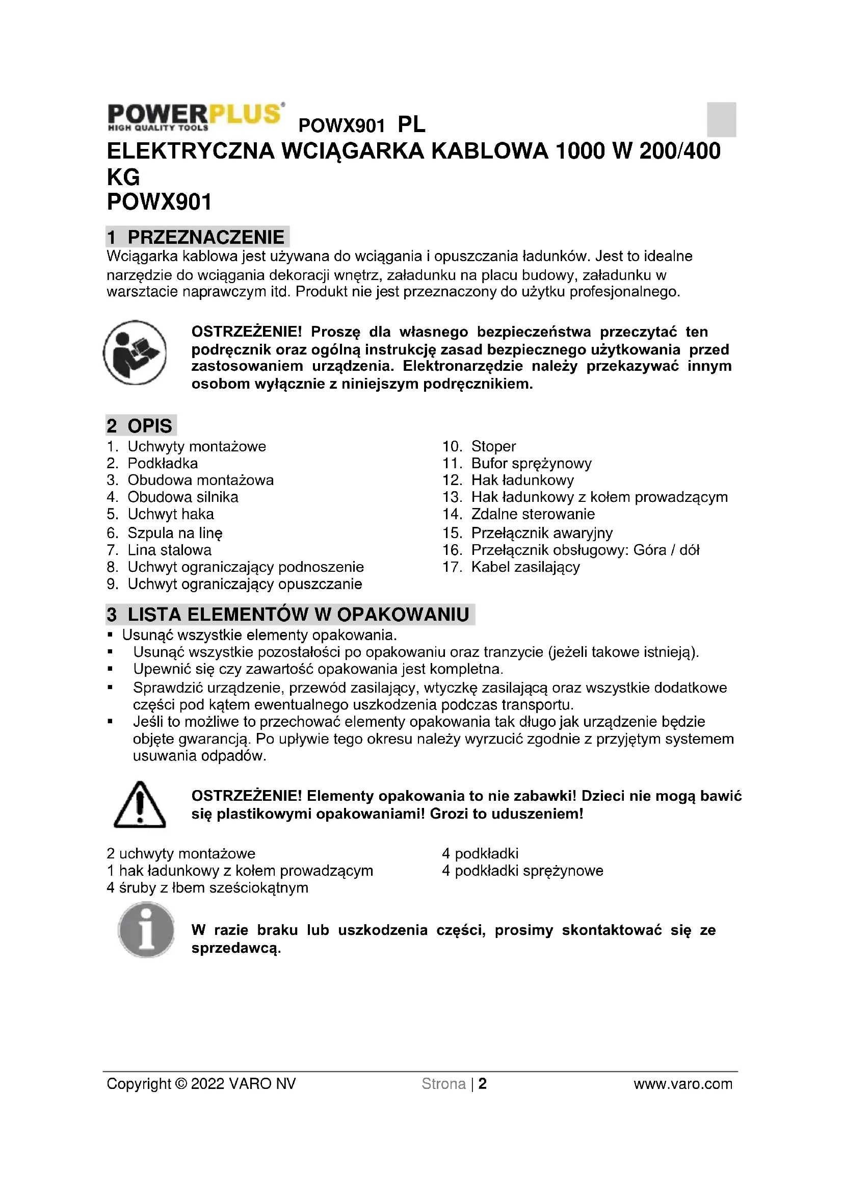 - Jeśli hamulce przestaną diałać i ładunek szybko opada, należy natychmiast nacisnąć wyłącznik, a następnie włącznik. Po rozładowaniu przesłać urządzenie do naprawy do wykwalifikowanego specjalisty.POWX901 PL Copyright © 2022 VARO NV Strona | 6 www.varo.com