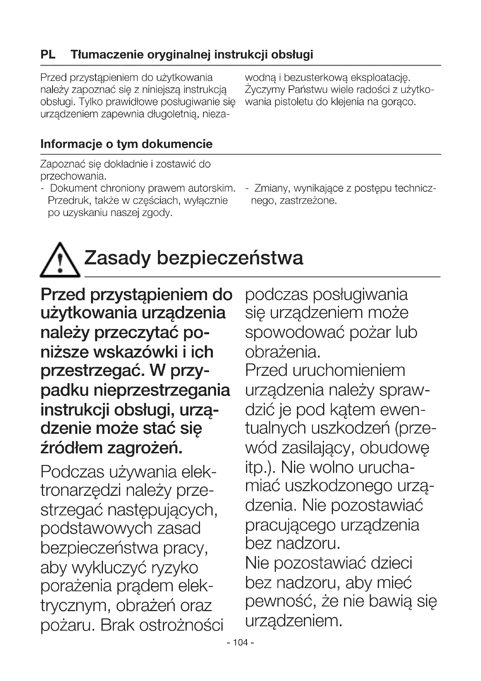ZÁRUKA ROK VÝROBCU ZÁRUKA ROKY VÝROBCU ZÁRUKA ROKOV VÝROBCU Technické údaje GlueMatic 1011 GlueMatic 3011Fáza ohrevu: 7 – 8min. cca 7min.Teplota tavenia: 200°C 200°CVýkon: 13g/min. 16g/min.Rozmery (D׊×V): 175×30×125 mm 206×54×180mmSieťové napätie:100 – 240 V (plynulo bez prepínania)100 – 240 V (plynulo bez prepínania)Výkon: Fáza ohrevu 175W Fáza pokoja cca 16W Pracovná fáza cca 40WFáza ohrevu 200W Fáza pokoja cca 16W Pracovná fáza cca 45WTrieda ochrany: II IIHmotnosť: 300g 320gLepiace tyčinky: Originálne lepiace tyčinky STEINEL a HenkelOriginálne lepiace tyčinky STEINEL a HenkelTechnické zmeny vyhradené- 104 - Przed przystąpieniem do użytkowania urządzenia należy przeczytać po- niższe wskazówki iich przestrzegać. Wprzy- padku nieprzestrzegania instrukcji obsługi, urzą- dzenie może stać się źródłem zagrożeń. Podczas używania elek- tronarzędzi należy prze- strzegać następujących, podstawowych zasad bezpieczeństwa pracy, aby wykluczyć ryzyko porażenia prądem elek- trycznym, obrażeń oraz pożaru. Brak ostrożności podczas posługiwania się urządzeniem może spowodować pożar lub obrażenia. Przed uruchomieniem urządzenia należy spraw- dzić je pod kątem ewen- tualnych uszkodzeń (prze- wód zasilający, obudowę itp.). Nie wolno urucha- miać uszkodzonego urzą- dzenia. Nie pozostawiać pracującego urządzenia bez nadzoru. Nie pozostawiać dzieci bez nadzoru, aby mieć pewność, że nie bawią się urządzeniem. Przed przystąpieniem do użytkowania należy zapoznać się zniniejszą instrukcją obsługi. Tylko prawidłowe posługiwanie się urządzeniem zapewnia długoletnią, nieza- wodną i bezusterkową eksploatację. Życzymy Państwu wiele radości z użytko- wania pistoletu do klejenia na gorąco. Tłumaczenie oryginalnej instrukcji obsługi Informacje o tym dokumencie Zapoznać się dokładnie izostawić do przechowania. - Dokument chroniony prawem autorskim. Przedruk, także wczęściach, wyłącznie po uzyskaniu naszej zgody. - Zmiany, wynikające zpostępu technicz- nego, zastrzeżone. Zasady bezpieczeństwa PL- 105 -