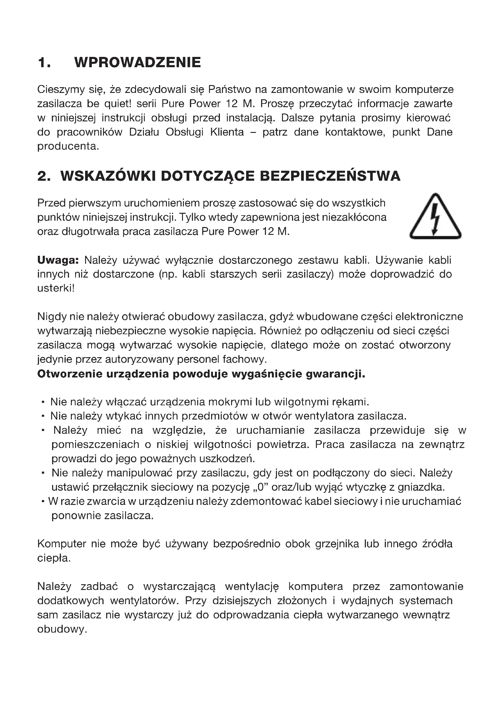 Przed pierwszym uruchomieniem proszę zastosować się do wszystkich punktów niniejszej instrukcji Tylko wtedy zapewniona jest niezakłócona oraz długotrwała praca zasilacza Pure Power 12 M Uwaga: Należy używać wyłącznie dostarczonego zestawu kabli Używanie kabli innych niż dostarczone (np kabli starszych serii zasilaczy) może doprowadzić do usterki! Nigdy nie należy otwierać obudowy zasilacza, gdyż wbudowane części elektroniczne wytwarzają niebezpieczne wysokie napięcia Również po odłączeniu od sieci części zasilacza mogą wytwarzać wysokie napięcie, dlatego może on zostać otworzony jedynie przez autoryzowany personel fachowy Otworzenie urządzenia powoduje wygaśnięcie gwarancji. ∙ Nie należy włączać urządzenia mokrymi lub wilgotnymi rękami ∙ Nie należy wtykać innych przedmiotów w otwór wentylatora zasilacza ∙ Należy mieć na względzie, że uruchamianie zasilacza przewiduje się w pomieszczeniach o niskiej wilgotności powietrza Praca zasilacza na zewnątrz prowadzi do jego poważnych uszkodzeń ∙ Nie należy manipulować przy zasilaczu, gdy jest on podłączony do sieci Należy ustawić przełącznik sieciowy na pozycję „0” oraz/lub wyjąć wtyczkę z gniazdka ∙ W razie zwarcia w urządzeniu należy zdemontować kabel sieciowy i nie uruchamiać ponownie zasilacza Komputer nie może być używany bezpośrednio obok grzejnika lub innego źródła ciepła Należy zadbać o wystarczającą wentylację komputera przez zamontowanie dodatkowych wentylatorów Przy dzisiejszych złożonych i wydajnych systemach sam zasilacz nie wystarczy już do odprowadzania ciepła wytwarzanego wewnątrz obudowy28 29 W celu oczyszczenia zasilacza należy go całkowicie odłączyć z sieci Nie należy stosować wilgotnych ściereczek ani środków czyszczących Należy wyczyścić zasilacz jedynie z zewnątrz suchą ściereczką Przed uruchomieniem zasilacz powinien leżeć godzinę w temperaturze pokojowej, aby zapobiec utworzeniu się w nim skroplin